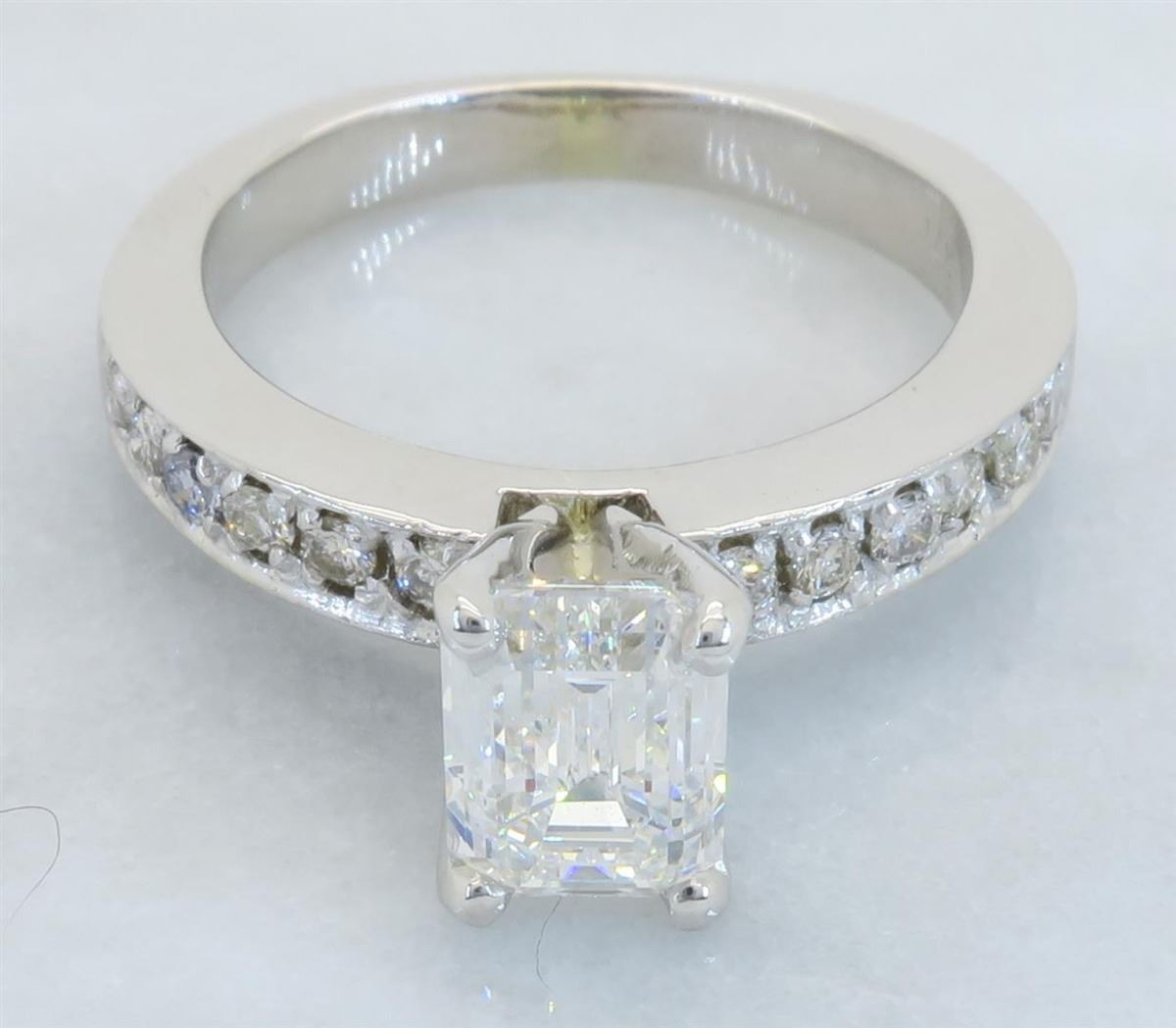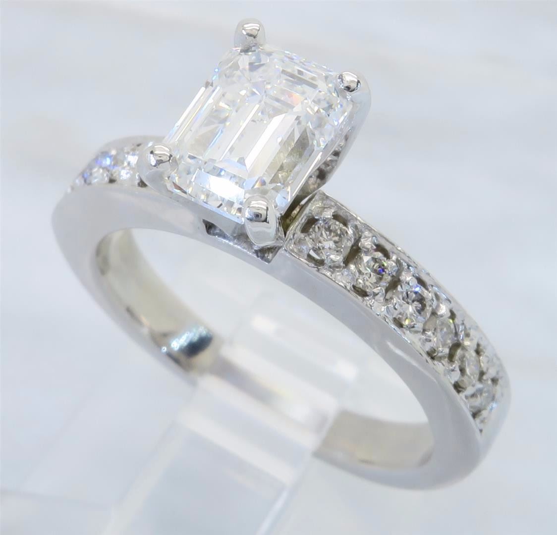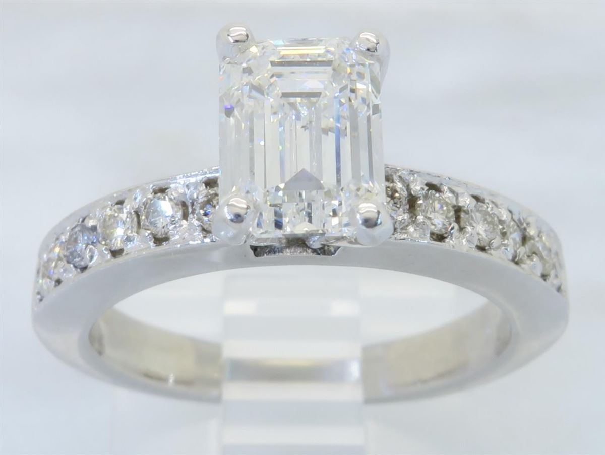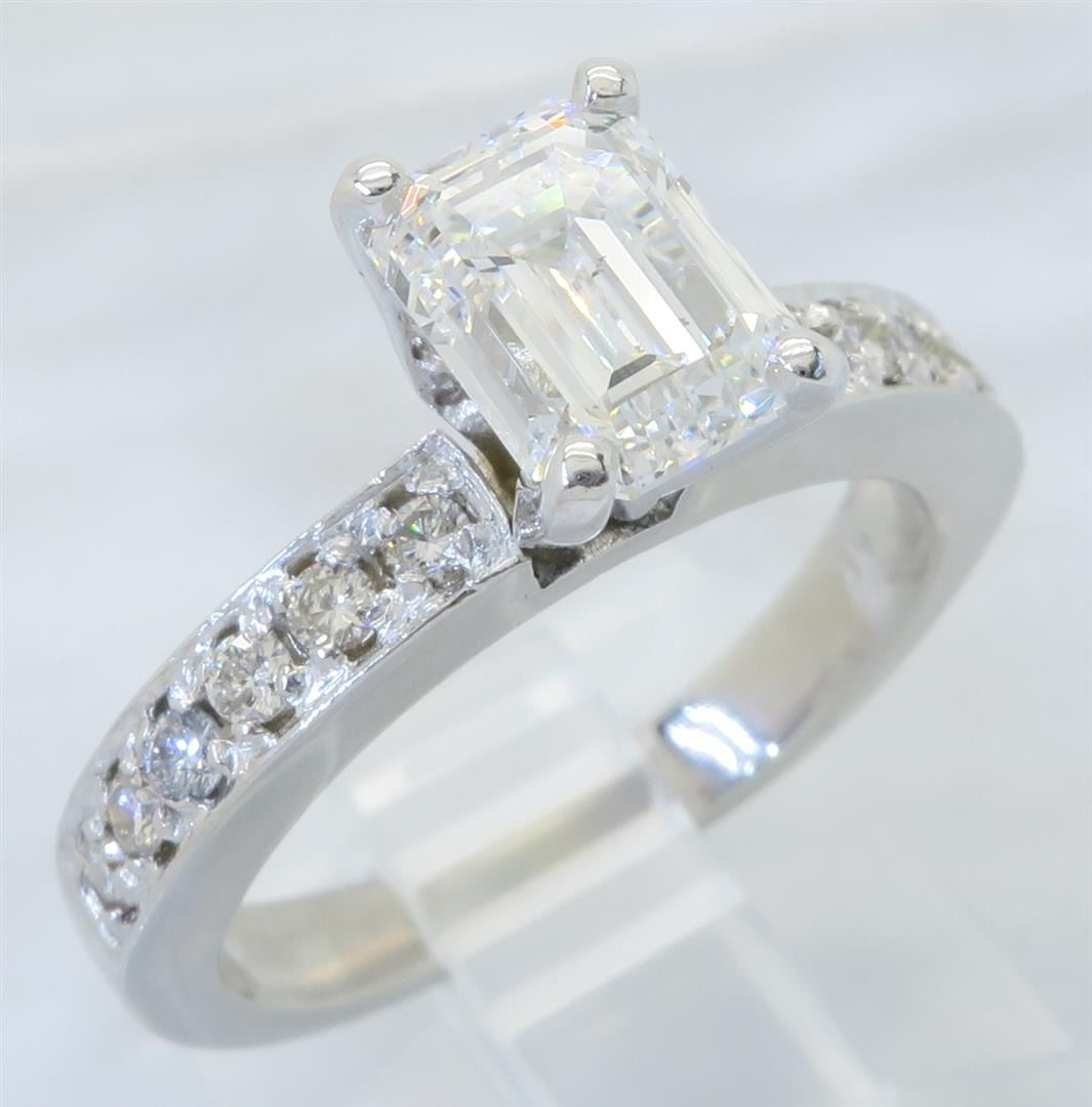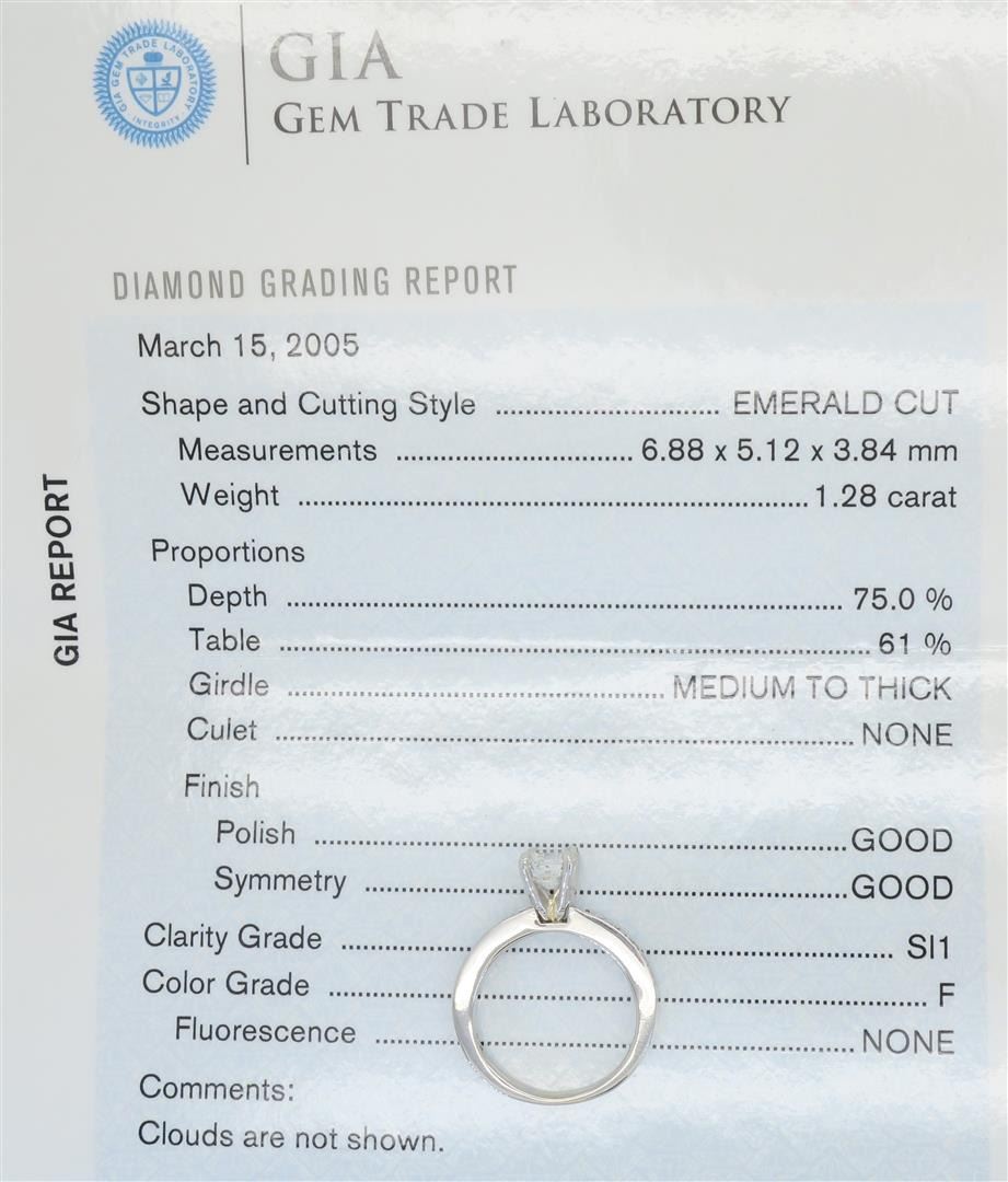 One tested 14K white gold diamond ring. Containing: One GIA Certified Emerald Cut Diamond. Size: 1.28CT, Clarity: SI1, Color: F. 12 Round Brilliant Cut Diamonds. Approximate total diamond weight: 1.52CTW. All diamonds are graded in the mounting unless otherwise stated. Weight of ring: 4.5 grams, Size: 5.5. GIA Appraised.