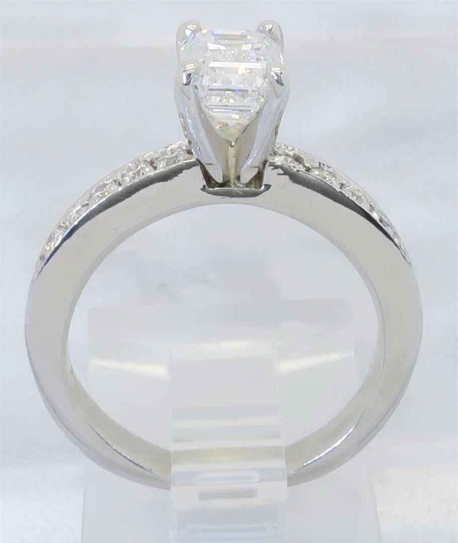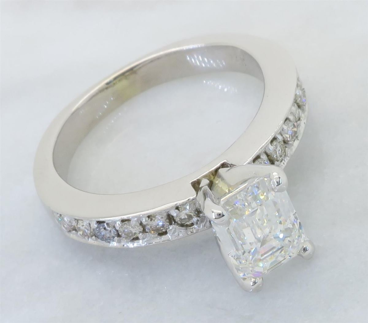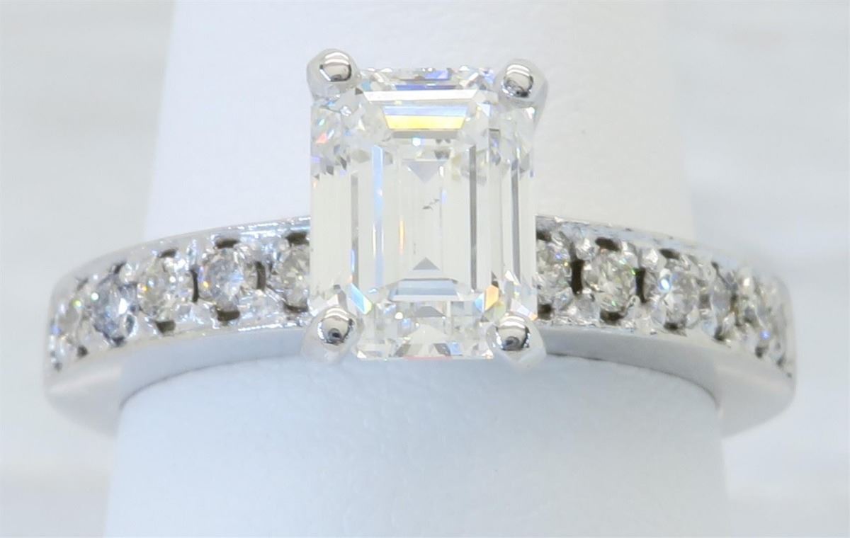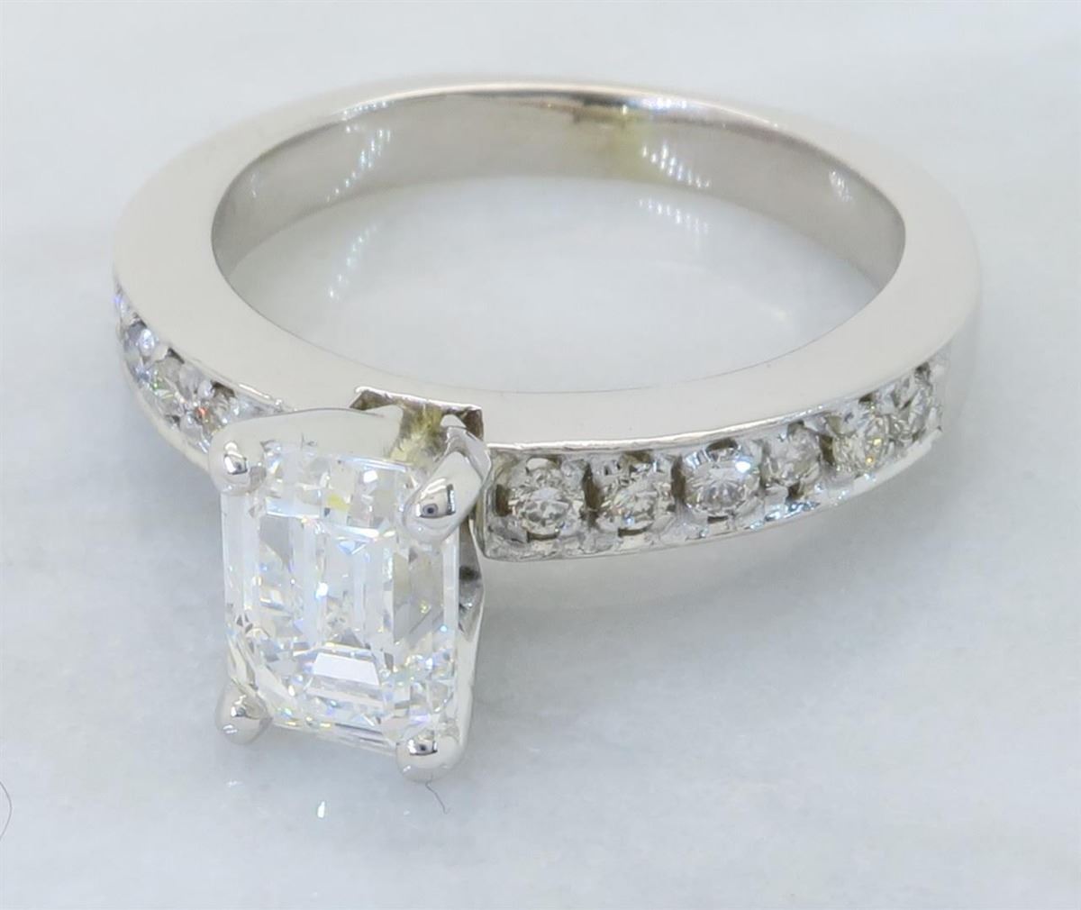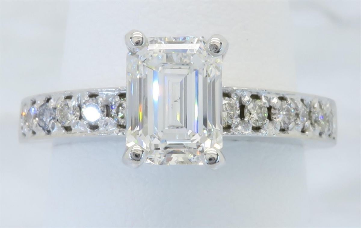 One tested 14K white gold diamond ring. Containing: One GIA Certified Emerald Cut Diamond. Size: 1.28CT, Clarity: SI1, Color: F. 12 Round Brilliant Cut Diamonds. Approximate total diamond weight: 1.52CTW. All diamonds are graded in the mounting unless otherwise stated. Weight of ring: 4.5 grams, Size: 5.5. GIA Appraised.