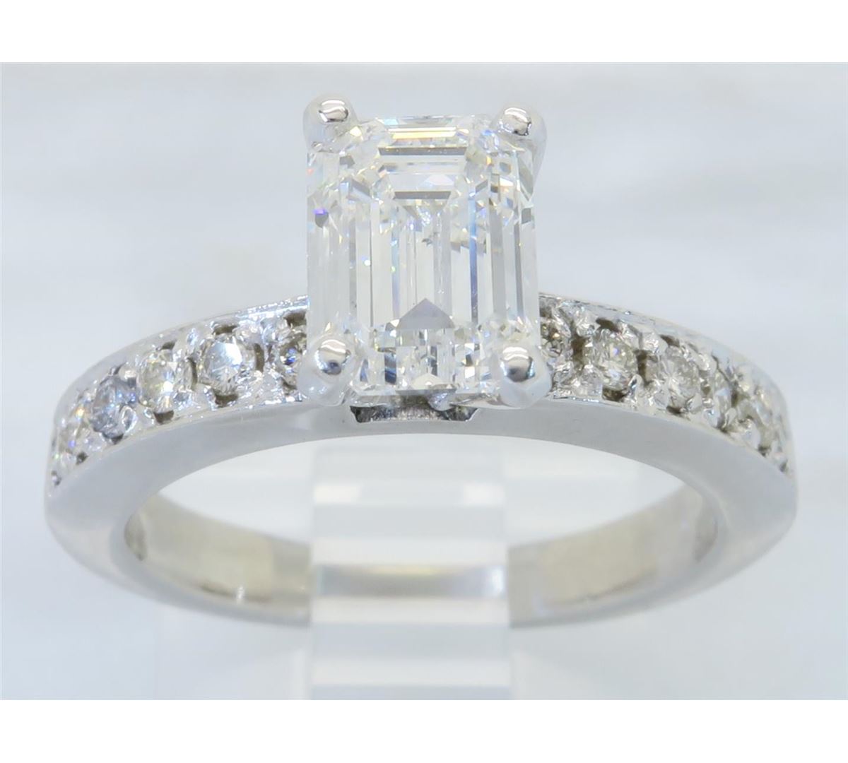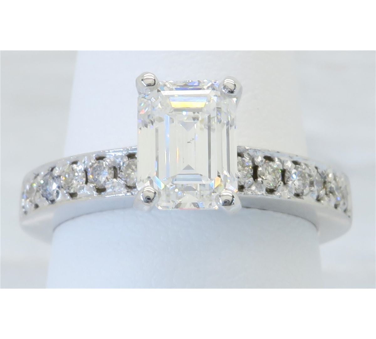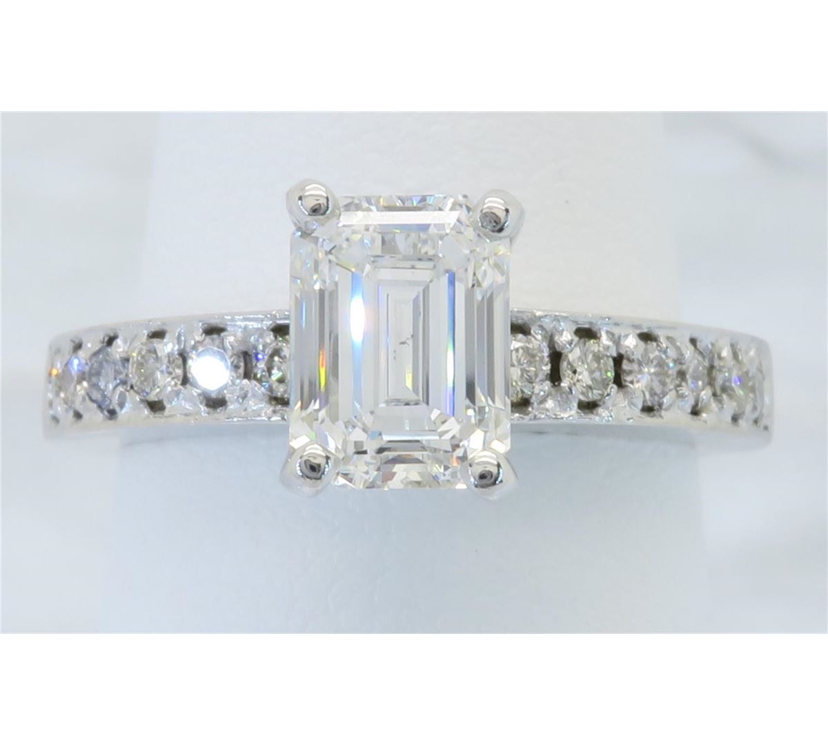 One tested 14K white gold diamond ring. Containing: One GIA Certified Emerald Cut Diamond. Size: 1.28CT, Clarity: SI1, Color: F. 12 Round Brilliant Cut Diamonds. Approximate total diamond weight: 1.52CTW. All diamonds are graded in the mounting unless otherwise stated. Weight of ring: 4.5 grams, Size: 5.5. GIA Appraised.