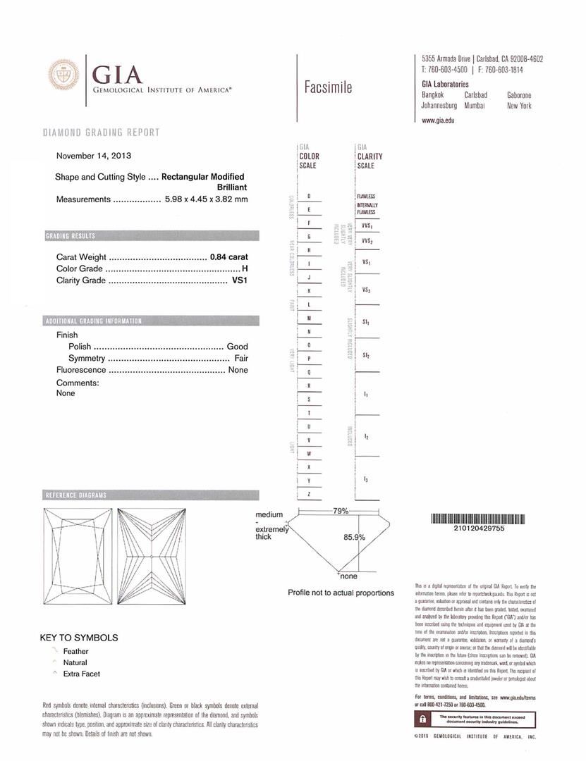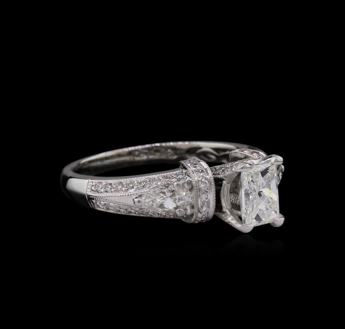 One electronically tested 18KT white gold ladies cast diamond unity ring. The featured diamond is set within an elaborate diamond set basket supported by stylized diamond set tapering shoulders, completed by a two millimeter wide band. Bright polish finish with milgrain detailing throughout. Identified with markings of "18K 750". Condition is new, good workmanship. Containing: One prong set Rectangular Modified Brilliant cut diamond, measuring 5.98 x 4.45 x 3.82mm exact weight 0.84ct. GIA Diamond Grading Report attached. Graded loose prior to setting in the GIA Laboratory, Report #2151742635. Clarity: VS-1. Color: 85.9%. Table 79.0%. Two prong set marquise shaped cut diamonds, measuring 5.30 x 2.90 x 2.00mm (depth est.) approximate total weight of 2 Stones = 0.38ct. Graded in the setting. Clarity: VS-2 to SI-1. Color: G Seventy-Four bead set round brilliant cut diamonds, measuring 1.10 - 0.90 x 0.60mm (depth est.) approximate total weight of 74 Stones = 0.30ct. Graded in the setting. Clarity: SI-1 to SI-2. Color: G - I. Total Weight of Diamonds 1.52ct. Total Weight of Ring 5.10gm. AIG Appraised at $13,290.00.