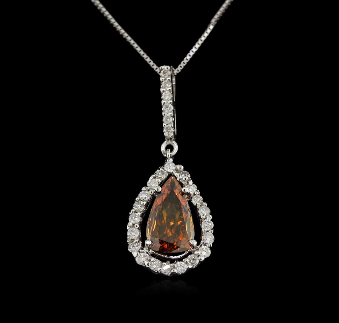 One electronically tested 14KT white gold lady's combination cast & assembled drop style pendant & chain 16.0" long, 0.7mm square box link with a spring ring clasp with a halo with a bright polish finish. Identified with markings of "14K". Condition is new, good workmanship. Containing: One prong set pear shaped cut diamond, measuring 11.37 x 6.47 x 2.72mm (depth est.) approximate weight of 1.16ct. The featured diamond has a slightly brownish hue. Artificially irradiated. Graded loose prior to setting in the GIA Laboratory, Report #1142778557. Clarity: VS-1 Cut Very Good Twenty prong set round brilliant cut diamonds, measuring 1.60 - 1.50 x 1.01mm (depth est.) approximate total weight of 20 Stones = 0.30ct. Graded in the setting. Clarity: SI-2 to I-1. Color: H - I. Cut Good Six prong set round brilliant cut diamonds, measuring 1.40 - 1.30 x 0.88mm (depth est.) approximate total weight of 6 Stones = 0.06ct. Graded in the setting. Clarity: SI-2 to I-1. Color: H - I. Cut Good. Total Weight of Diamonds 1.52ct. Total Weight of Pendant & Chain 3.00gm. GAS Appraised at $14,400.00.