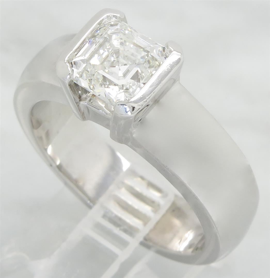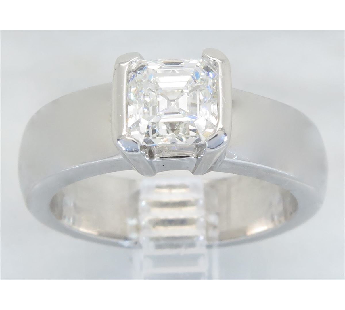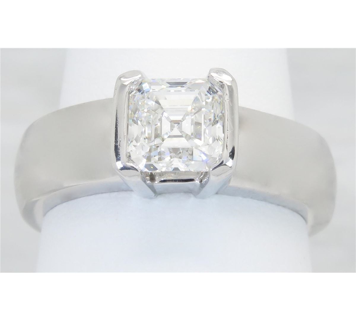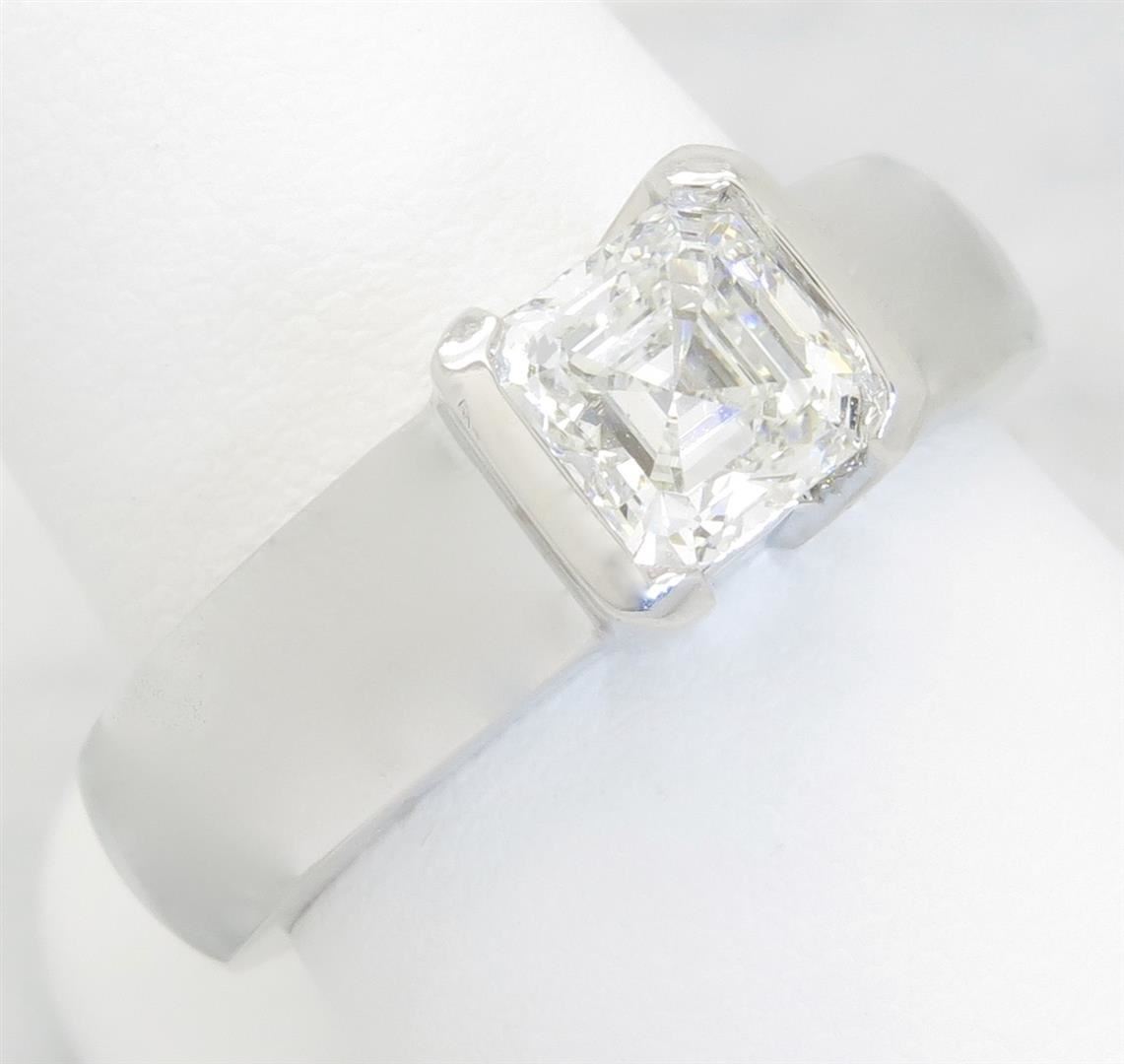 One tested 14K white gold certified diamond ring. Containing: One GIA Certified Asscher Cut Diamond set in a platinum head. Size: 1.56CT, Clarity: VVS2, Color: G. All diamonds are graded in the mounting unless otherwise stated. Weight of ring: 14.6 grams, Size: 8.0 GIA Appraised.
