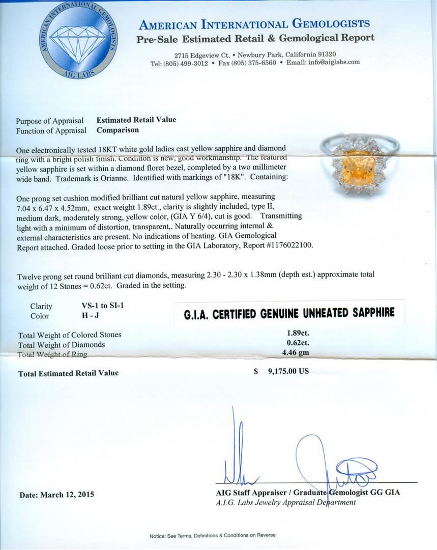 One electronically tested 18KT white gold ladies cast yellow sapphire and diamond ring with a bright polish finish. The featured yellow sapphire is set within a diamond floret bezel, completed by a two millimeter wide band. Trademark is Orianne. Identified with markings of "18K". Condition is new, good workmanship. Containing: One prong set cushion modified brilliant cut natural yellow sapphire, measuring 7.04 x 6.47 x 4.52mm, exact weight 1.89ct., clarity is slightly included, type II, medium dark, moderately strong, yellow color, (GIA Y 6/4), cut is good. Transmitting light with a minimum of distortion, transparent,. Naturally occurring internal & external characteristics are present. No indications of heating. GIA Gemological Report attached. Graded loose prior to setting in the GIA Laboratory, Report #1176022100.Twelve prong set round brilliant cut diamonds, measuring 2.30 - 2.30 x 1.38mm (depth est.) approximate total weight of 12 Stones = 0.62ct. Graded in the setting. Clarity: VS-1 to SI-1. Color: H - J. Total Weight of Colored Stones 1.89ct. Total Weight of Diamonds 0.62ct. Total Weight of Ring 4.46gm. AIG Appraised at $9,175.00.