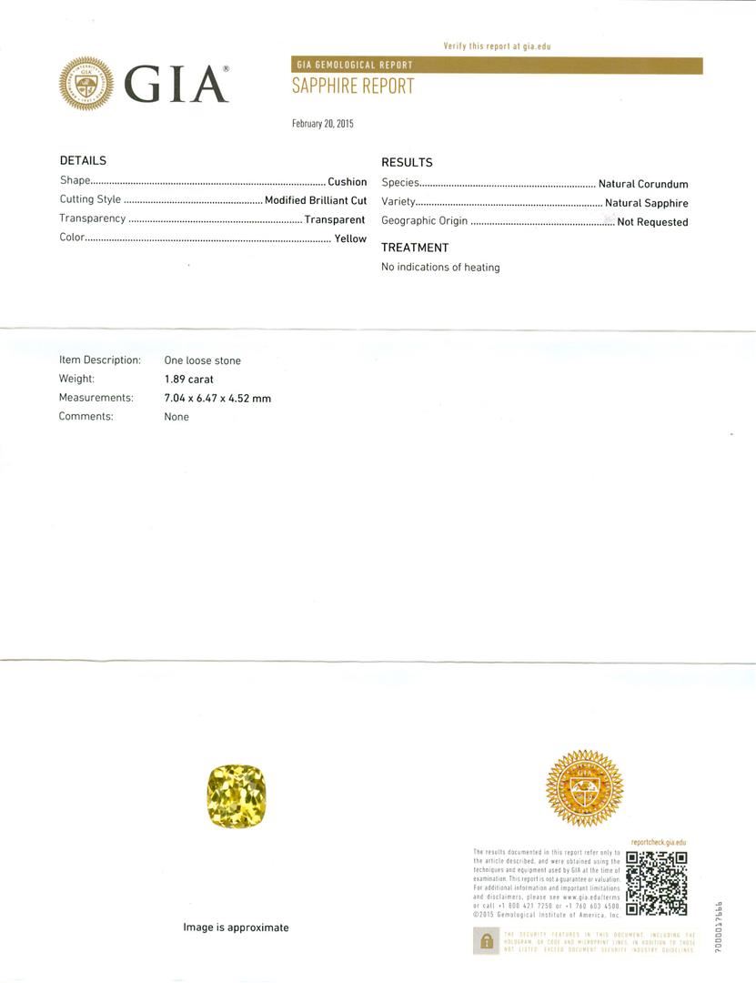 One electronically tested 18KT white gold ladies cast yellow sapphire and diamond ring with a bright polish finish. The featured yellow sapphire is set within a diamond floret bezel, completed by a two millimeter wide band. Trademark is Orianne. Identified with markings of "18K". Condition is new, good workmanship. Containing: One prong set cushion modified brilliant cut natural yellow sapphire, measuring 7.04 x 6.47 x 4.52mm, exact weight 1.89ct., clarity is slightly included, type II, medium dark, moderately strong, yellow color, (GIA Y 6/4), cut is good. Transmitting light with a minimum of distortion, transparent,. Naturally occurring internal & external characteristics are present. No indications of heating. GIA Gemological Report attached. Graded loose prior to setting in the GIA Laboratory, Report #1176022100.Twelve prong set round brilliant cut diamonds, measuring 2.30 - 2.30 x 1.38mm (depth est.) approximate total weight of 12 Stones = 0.62ct. Graded in the setting. Clarity: VS-1 to SI-1. Color: H - J. Total Weight of Colored Stones 1.89ct. Total Weight of Diamonds 0.62ct. Total Weight of Ring 4.46gm. AIG Appraised at $9,175.00.