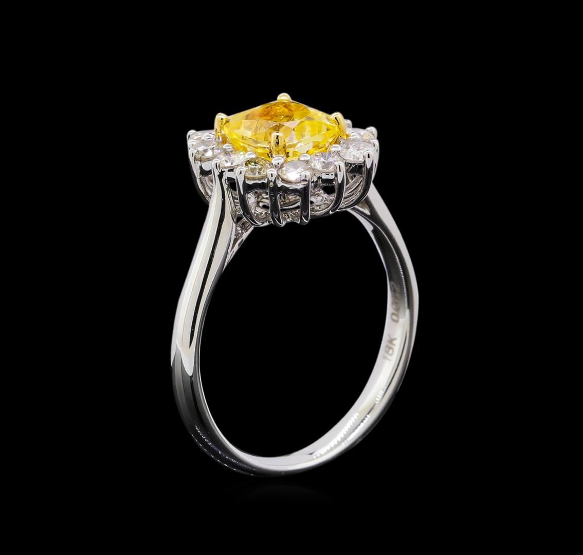 One electronically tested 18KT white gold ladies cast yellow sapphire and diamond ring with a bright polish finish. The featured yellow sapphire is set within a diamond floret bezel, completed by a two millimeter wide band. Trademark is Orianne. Identified with markings of "18K". Condition is new, good workmanship. Containing: One prong set cushion modified brilliant cut natural yellow sapphire, measuring 7.04 x 6.47 x 4.52mm, exact weight 1.89ct., clarity is slightly included, type II, medium dark, moderately strong, yellow color, (GIA Y 6/4), cut is good. Transmitting light with a minimum of distortion, transparent,. Naturally occurring internal & external characteristics are present. No indications of heating. GIA Gemological Report attached. Graded loose prior to setting in the GIA Laboratory, Report #1176022100.Twelve prong set round brilliant cut diamonds, measuring 2.30 - 2.30 x 1.38mm (depth est.) approximate total weight of 12 Stones = 0.62ct. Graded in the setting. Clarity: VS-1 to SI-1. Color: H - J. Total Weight of Colored Stones 1.89ct. Total Weight of Diamonds 0.62ct. Total Weight of Ring 4.46gm. AIG Appraised at $9,175.00.