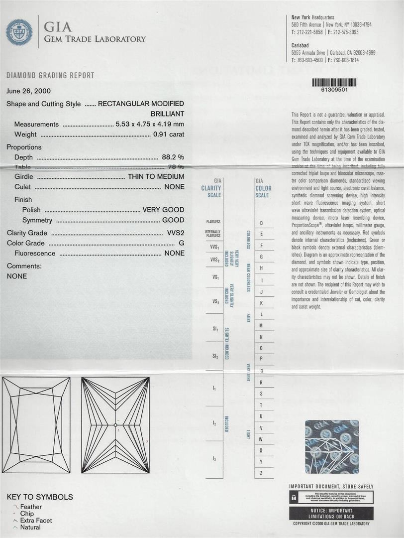 One electronically tested 14KT white gold ladies cast diamond unity ring with a bright polish finish. The featured cathedral set diamond is supported by diamond set shoulders, completed by a patterned three and one-half millimeter wide band. Identified with markings of "14K". Condition is new, good workmanship. Containing: One prong set Rectangular Modified Brilliant cut diamond, measuring 5.53 x 4.75 x 4.19mm exact weight 0.91ct. GIA Diamond Grading Report attached. Graded loose prior to setting in the GIA Laboratory, Report #11180010. Clarity: VVS-2. Color: G. Depth 88.2%. Table 78.0%. Twelve prong set round brilliant cut diamonds, measuring 2.80 - 2.70 x 1.65mm (depth est.) approximate total weight of 12 Stones = 0.95ct. Graded in the setting. Clarity: SI-1 to SI-2. Color: G - I Twenty flush set round brilliant cut diamonds, measuring 0.80 - 0.70 x 0.45mm (depth est.) approximate total weight of 20 Stones = 0.05ct. Graded in the setting. Clarity: SI-1 to SI-2. Color: G - I. Total Weight of Diamonds 1.91ct. Total Weight of Ring 4.95gm. AIG Appraised at $18,805.00.