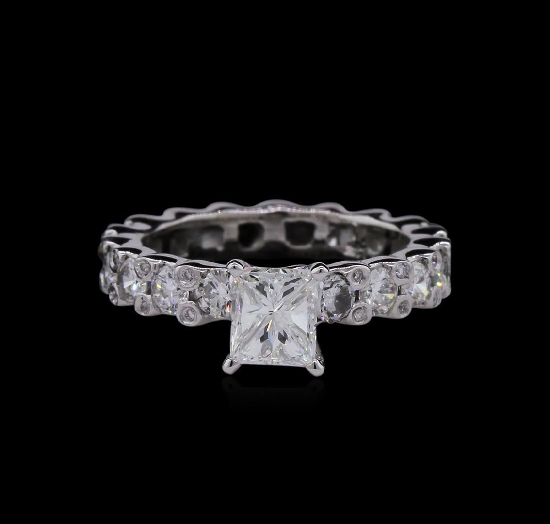 One electronically tested 14KT white gold ladies cast diamond unity ring with a bright polish finish. The featured cathedral set diamond is supported by diamond set shoulders, completed by a patterned three and one-half millimeter wide band. Identified with markings of "14K". Condition is new, good workmanship. Containing: One prong set Rectangular Modified Brilliant cut diamond, measuring 5.53 x 4.75 x 4.19mm exact weight 0.91ct. GIA Diamond Grading Report attached. Graded loose prior to setting in the GIA Laboratory, Report #11180010. Clarity: VVS-2. Color: G. Depth 88.2%. Table 78.0%. Twelve prong set round brilliant cut diamonds, measuring 2.80 - 2.70 x 1.65mm (depth est.) approximate total weight of 12 Stones = 0.95ct. Graded in the setting. Clarity: SI-1 to SI-2. Color: G - I Twenty flush set round brilliant cut diamonds, measuring 0.80 - 0.70 x 0.45mm (depth est.) approximate total weight of 20 Stones = 0.05ct. Graded in the setting. Clarity: SI-1 to SI-2. Color: G - I. Total Weight of Diamonds 1.91ct. Total Weight of Ring 4.95gm. AIG Appraised at $18,805.00.