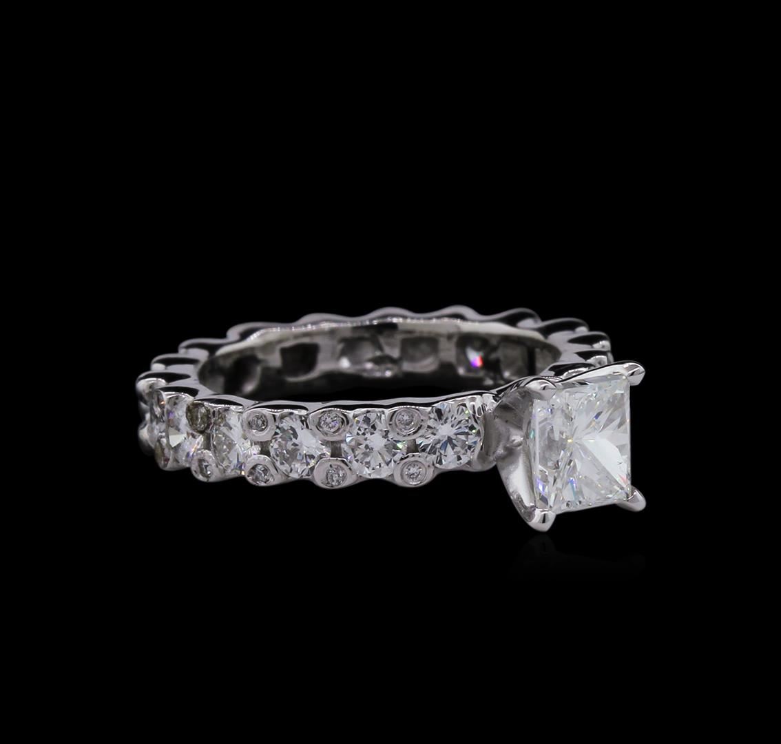 One electronically tested 14KT white gold ladies cast diamond unity ring with a bright polish finish. The featured cathedral set diamond is supported by diamond set shoulders, completed by a patterned three and one-half millimeter wide band. Identified with markings of "14K". Condition is new, good workmanship. Containing: One prong set Rectangular Modified Brilliant cut diamond, measuring 5.53 x 4.75 x 4.19mm exact weight 0.91ct. GIA Diamond Grading Report attached. Graded loose prior to setting in the GIA Laboratory, Report #11180010. Clarity: VVS-2. Color: G. Depth 88.2%. Table 78.0%. Twelve prong set round brilliant cut diamonds, measuring 2.80 - 2.70 x 1.65mm (depth est.) approximate total weight of 12 Stones = 0.95ct. Graded in the setting. Clarity: SI-1 to SI-2. Color: G - I Twenty flush set round brilliant cut diamonds, measuring 0.80 - 0.70 x 0.45mm (depth est.) approximate total weight of 20 Stones = 0.05ct. Graded in the setting. Clarity: SI-1 to SI-2. Color: G - I. Total Weight of Diamonds 1.91ct. Total Weight of Ring 4.95gm. AIG Appraised at $18,805.00.