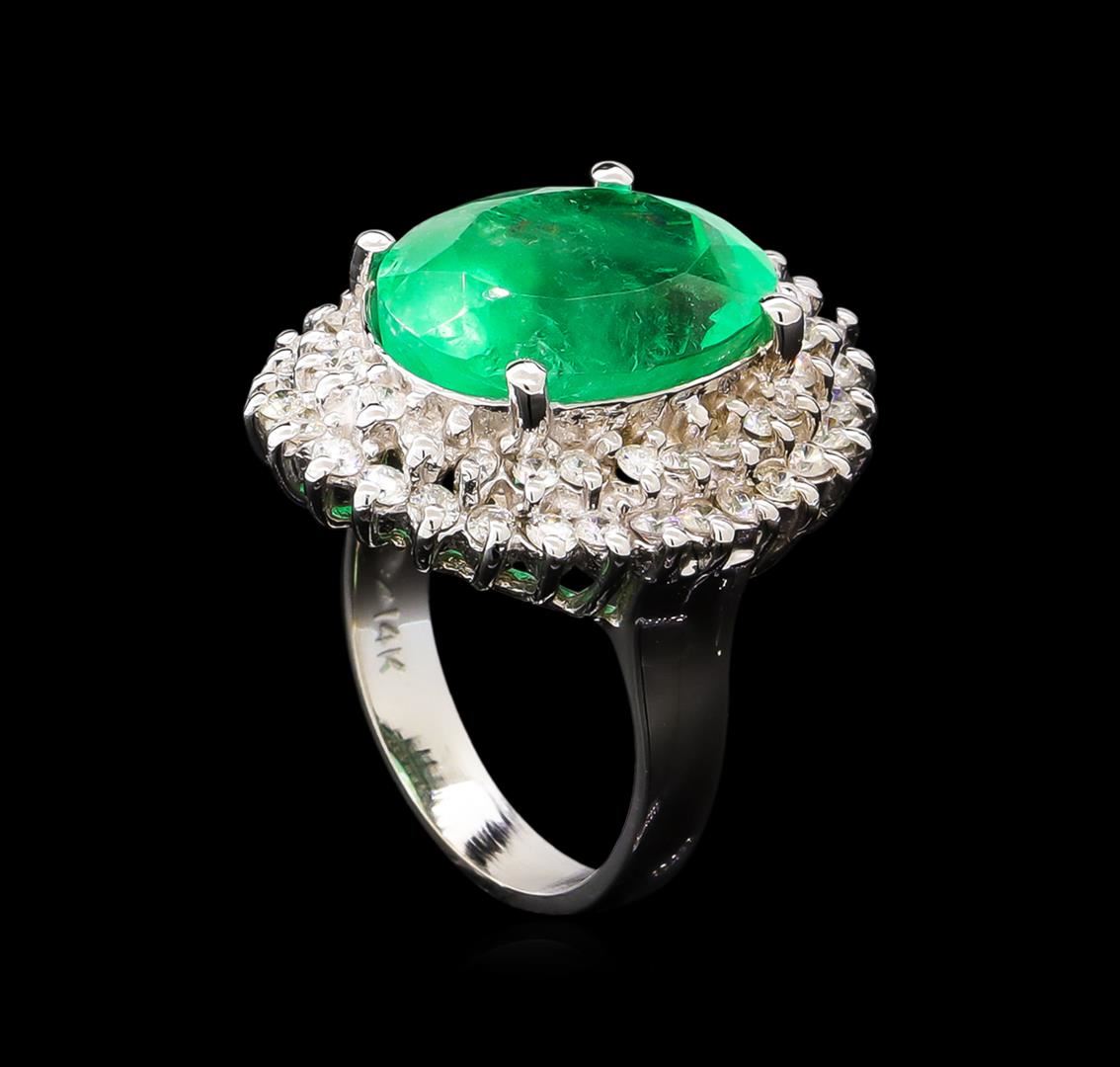 One electronically tested 14KT white gold lady's cast fashion ring with a double basket halo with a bright polish finish. The featured lady's ring has a shank measuring 3.51 millimeters wide. Identified with markings of "14K". Condition is new, good workmanship. Containing: One prong set oval modified brilliant cut natural emerald, measuring 15.27 x 11.74 x 9.79mm, exact weight 10.05ct., clarity is moderately included, type III, medium, very slightly grayish, green color, (GIA G 5/3), cut is good. Transmitting light somewhat diffusely, transparent to translucent. Naturally occurring internal & external characteristics are present. Clarity enhanced. Graded loose prior to setting in the GIA Laboratory, Report #6177501873.Thirty prong set round brilliant cut diamonds, measuring 1.90 - 1.80 x 1.15mm (depth est.) approximate total weight of 30 Stones = 0.71ct. Graded in the setting. Clarity: SI-1 to SI-2. Color: G - Good Twenty-Six prong set round brilliant cut diamonds, measuring 1.70 - 1.60 x 1.02mm (depth est.) approximate total weight of 26 Stones = 0.44ct. Graded in the setting. Clarity: SI-1 to I-1. Color: G - Good. Total Weight of Colored Stones 10.05ct. Total Weight of Diamonds 1.15ct. Total Weight of Ring 9.40gm. GAS Appraised at $18,670.00.