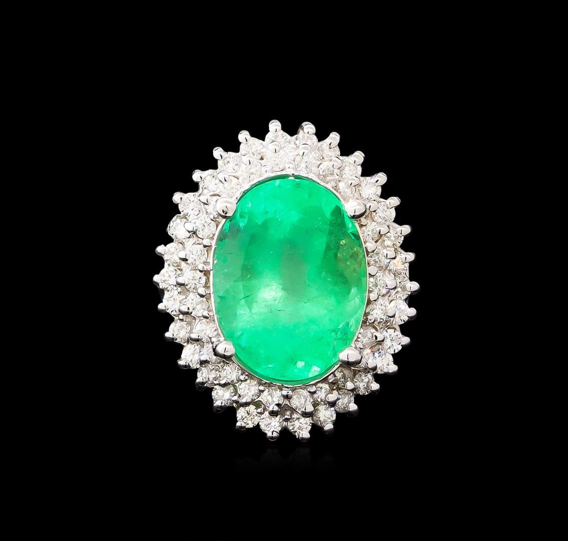 One electronically tested 14KT white gold lady's cast fashion ring with a double basket halo with a bright polish finish. The featured lady's ring has a shank measuring 3.51 millimeters wide. Identified with markings of "14K". Condition is new, good workmanship. Containing: One prong set oval modified brilliant cut natural emerald, measuring 15.27 x 11.74 x 9.79mm, exact weight 10.05ct., clarity is moderately included, type III, medium, very slightly grayish, green color, (GIA G 5/3), cut is good. Transmitting light somewhat diffusely, transparent to translucent. Naturally occurring internal & external characteristics are present. Clarity enhanced. Graded loose prior to setting in the GIA Laboratory, Report #6177501873.Thirty prong set round brilliant cut diamonds, measuring 1.90 - 1.80 x 1.15mm (depth est.) approximate total weight of 30 Stones = 0.71ct. Graded in the setting. Clarity: SI-1 to SI-2. Color: G - Good Twenty-Six prong set round brilliant cut diamonds, measuring 1.70 - 1.60 x 1.02mm (depth est.) approximate total weight of 26 Stones = 0.44ct. Graded in the setting. Clarity: SI-1 to I-1. Color: G - Good. Total Weight of Colored Stones 10.05ct. Total Weight of Diamonds 1.15ct. Total Weight of Ring 9.40gm. GAS Appraised at $18,670.00.
