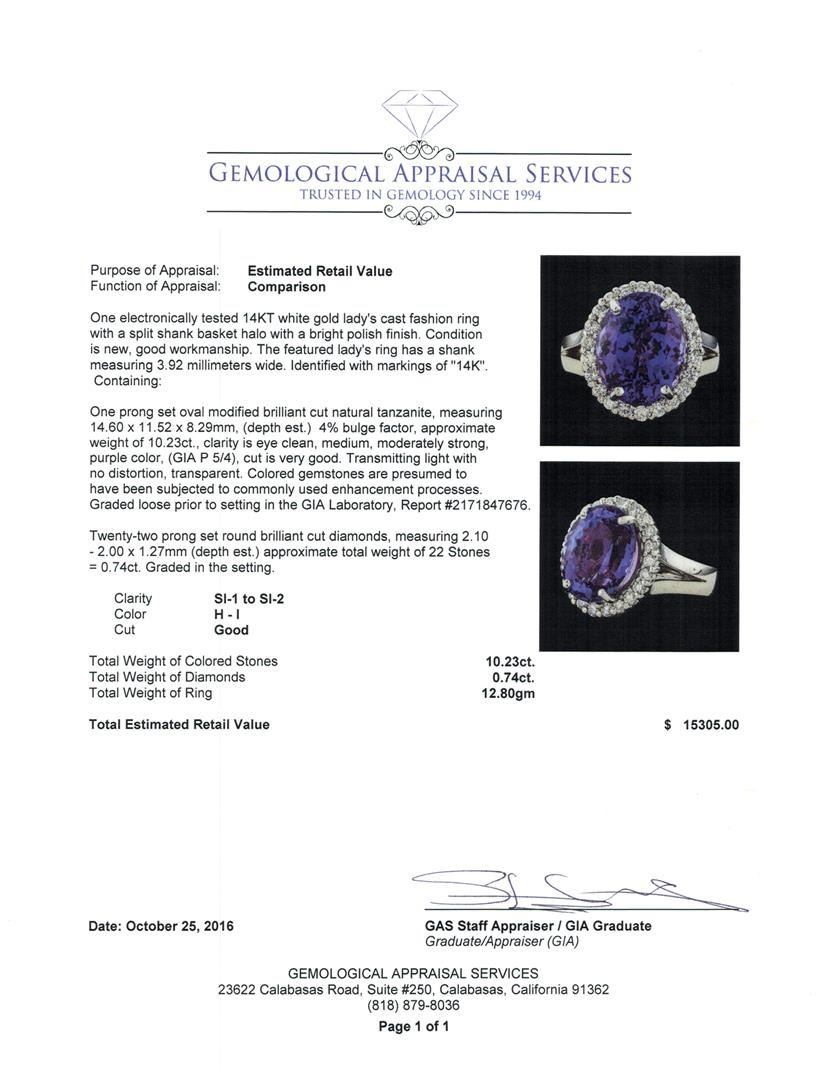 One electronically tested 14KT white gold lady's cast fashion ring with a split shank basket halo with a bright polish finish. The featured lady's ring has a shank measuring 3.92 millimeters wide. Identified with markings of '14K'. Condition is new, good workmanship. Containing: One prong set oval modified brilliant cut natural tanzanite, measuring 14.60 x 11.52 x 8.29mm, (depth est.) 4%. bulge factor, approximate weight of 10.23ct., clarity is eye clean, medium, moderately strong, purple color, (GIA P 5/4), cut is very good. Transmitting light with no distortion, transparent. Colored gemstones are presumed to have been subjected to commonly used enhancement processes. Graded loose prior to setting in the GIA Laboratory, Report #2171847676. Twenty-Two prong set round brilliant cut diamonds, measuring 2.10 - 2.00 x 1.27mm (depth est.) approximate total weight of 22 Stones = 0.74ct. Graded in the setting. Clarity SI-1 to SI-2. Color: H - I Cut Good. Total Weight of Colored Stones 10.23ct.. Total Weight of Diamonds 0.74ct.. Total Weight of Ring 12.80gm. GAS Appraised at $15,305.00.