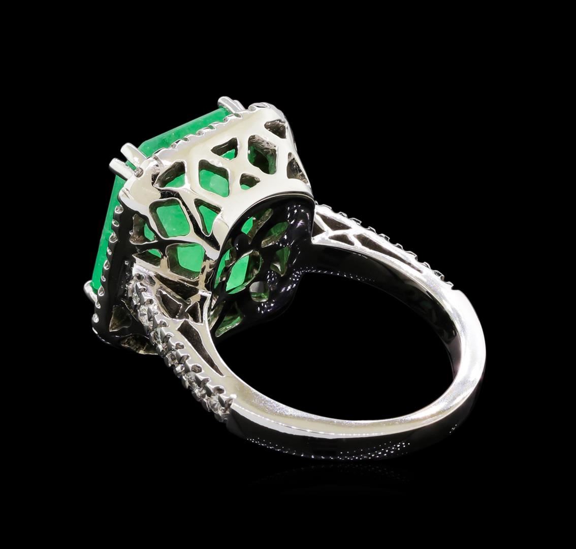 One electronically tested 14KT white gold lady's cast fashion ring with a basket halo with a bright polish finish. The featured lady's ring has a shank measuring 2.47 millimeters wide. Identified with markings of "14K". Condition is new, good workmanship. Containing: One prong set emerald step cut natural emerald, measuring 14.00 x 11.78 x 10.07mm, exact weight 10.54ct., clarity is severely included, type III, medium, very slightly grayish, green color, (GIA G 5/3), cut is good. Transmitting light diffusely, opaque to translucent. Naturally occurring internal & external characteristics are present. Clarity enhanced. Graded loose prior to setting in the GIA Laboratory, Report #2175501538.Thirty-Four prong set round brilliant cut diamonds, measuring 1.60 - 1.50 x 0.96mm (depth est.) approximate total weight of 34 Stones = 0.50ct. Graded in the setting. Clarity: SI-1 to I-1. Color: G - Good. Total Weight of Colored Stones 10.54ct. Total Weight of Diamonds 0.50ct. Total Weight of Ring 10.40gm. GAS Appraised at $9,475.00.