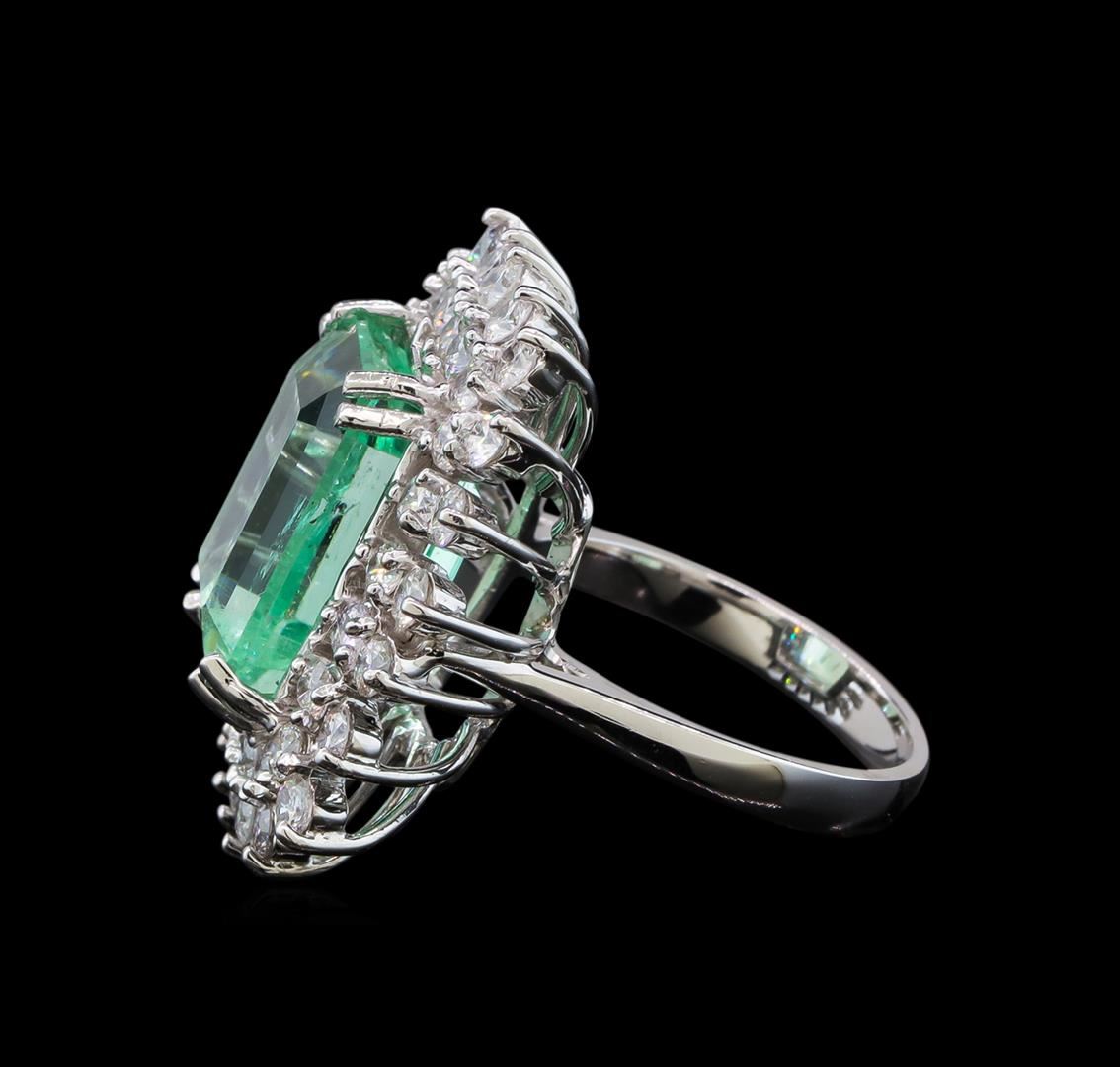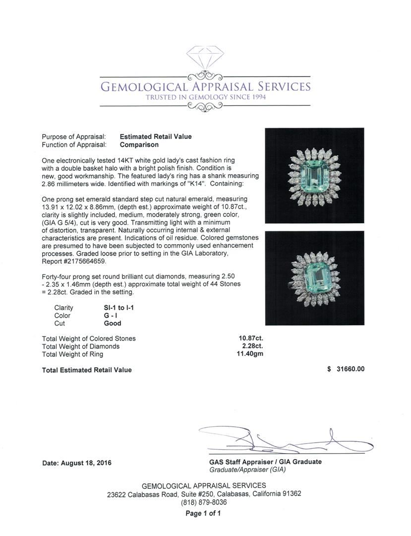 One electronically tested 14KT white gold lady's cast fashion ring with a double basket halo with a bright polish finish. The featured lady's ring has a shank measuring 2.86 millimeters wide. Identified with markings of 'K14'. Condition is new, good workmanship. Containing: One prong set emerald standard step cut natural emerald, measuring 13.91 x 12.02 x 8.86mm, (depth est.) approximate weight of 10.87ct., clarity is slightly included, medium, moderately strong, green color, (GIA G 5/4), cut is very good. Transmitting light with a minimum of distortion, transparent. Naturally occurring internal & external characteristics are present. Indications of oil residue. Colored gemstones are presumed to have been subjected to commonly used enhancement processes. Graded loose prior to setting in the GIA Laboratory, Report #2175664659. Forty-Four prong set round brilliant cut diamonds, measuring 2.50 - 2.35 x 1.46mm (depth est.) approximate total weight of 44 Stones = 2.28ct. Graded in the setting. Clarity SI-1 to I-1. Color: G - I Cut Good. Total Weight of Colored Stones 10.87ct.. Total Weight of Diamonds 2.28ct.. Total Weight of Ring 11.40gm. GAS Appraised at $31,660.00.