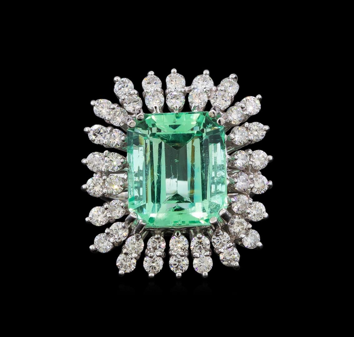 One electronically tested 14KT white gold lady's cast fashion ring with a double basket halo with a bright polish finish. The featured lady's ring has a shank measuring 2.86 millimeters wide. Identified with markings of 'K14'. Condition is new, good workmanship. Containing: One prong set emerald standard step cut natural emerald, measuring 13.91 x 12.02 x 8.86mm, (depth est.) approximate weight of 10.87ct., clarity is slightly included, medium, moderately strong, green color, (GIA G 5/4), cut is very good. Transmitting light with a minimum of distortion, transparent. Naturally occurring internal & external characteristics are present. Indications of oil residue. Colored gemstones are presumed to have been subjected to commonly used enhancement processes. Graded loose prior to setting in the GIA Laboratory, Report #2175664659. Forty-Four prong set round brilliant cut diamonds, measuring 2.50 - 2.35 x 1.46mm (depth est.) approximate total weight of 44 Stones = 2.28ct. Graded in the setting. Clarity SI-1 to I-1. Color: G - I Cut Good. Total Weight of Colored Stones 10.87ct.. Total Weight of Diamonds 2.28ct.. Total Weight of Ring 11.40gm. GAS Appraised at $31,660.00.