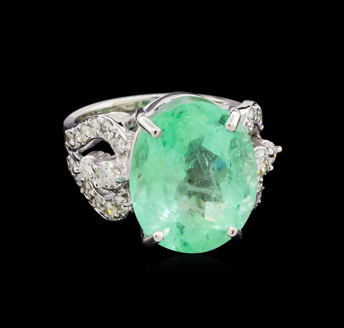 One electronically tested 14KT white gold lady's cast fashion ring with a split shank with a bright polish finish. The featured lady's ring has a shank measuring 3.72 millimeters wide. Identified with markings of "K14". Condition is new, good workmanship. Containing: One prong set oval modified brilliant cut natural emerald, measuring 15.99 x 13.33 x 9.39mm, exact weight 11.16ct., clarity is moderately included, type III, medium, very slightly grayish, green color, (GIA G 5/3), cut is good. Transmitting light somewhat diffusely, transparent to translucent. Naturally occurring internal & external characteristics are present. Clarity enhanced. Graded loose prior to setting in the GIA Laboratory, Report #2175501885.Four prong set round brilliant cut diamonds, measuring 2.80 - 2.60 x 1.65mm (depth est.) approximate total weight of 4 Stones = 0.29ct. Graded in the setting. Clarity: SI-1 to SI-2. Color: H - I. Cut Very Good Twenty-Four prong set round brilliant cut diamonds, measuring 2.00 - 1.90 x 1.17mm (depth est.) approximate total weight of 24 Stones = 0.65ct. Graded in the setting. Clarity: SI-1 to I-1. Color: H - I. Cut Good. Total Weight of Colored Stones 11.16ct. Total Weight of Diamonds 0.94ct. Total Weight of Ring 10.10gm. GAS Appraised at $23,975.00.