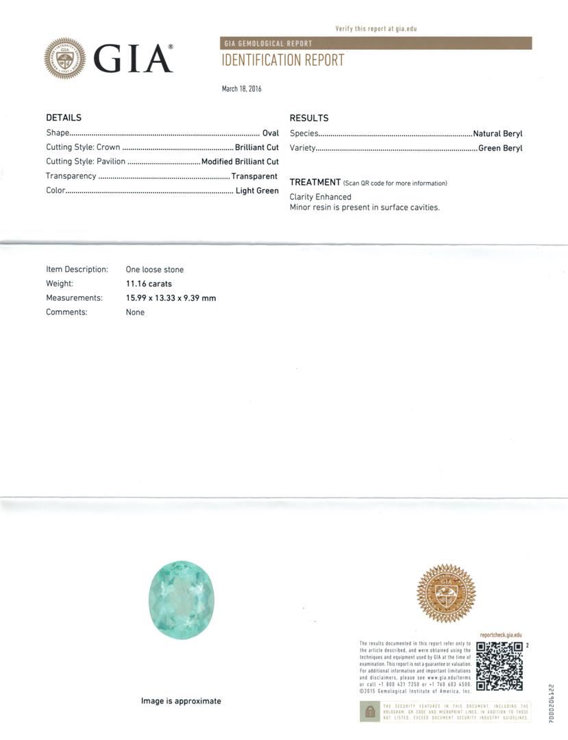 One electronically tested 14KT white gold lady's cast fashion ring with a split shank with a bright polish finish. The featured lady's ring has a shank measuring 3.72 millimeters wide. Identified with markings of "K14". Condition is new, good workmanship. Containing: One prong set oval modified brilliant cut natural emerald, measuring 15.99 x 13.33 x 9.39mm, exact weight 11.16ct., clarity is moderately included, type III, medium, very slightly grayish, green color, (GIA G 5/3), cut is good. Transmitting light somewhat diffusely, transparent to translucent. Naturally occurring internal & external characteristics are present. Clarity enhanced. Graded loose prior to setting in the GIA Laboratory, Report #2175501885.Four prong set round brilliant cut diamonds, measuring 2.80 - 2.60 x 1.65mm (depth est.) approximate total weight of 4 Stones = 0.29ct. Graded in the setting. Clarity: SI-1 to SI-2. Color: H - I. Cut Very Good Twenty-Four prong set round brilliant cut diamonds, measuring 2.00 - 1.90 x 1.17mm (depth est.) approximate total weight of 24 Stones = 0.65ct. Graded in the setting. Clarity: SI-1 to I-1. Color: H - I. Cut Good. Total Weight of Colored Stones 11.16ct. Total Weight of Diamonds 0.94ct. Total Weight of Ring 10.10gm. GAS Appraised at $23,975.00.