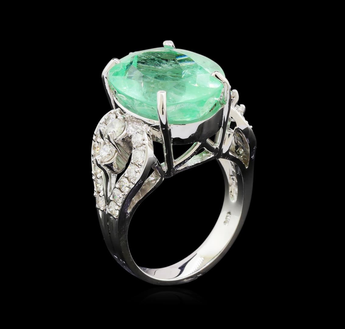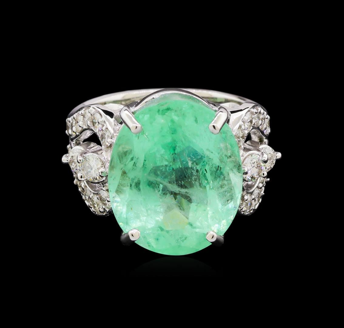 One electronically tested 14KT white gold lady's cast fashion ring with a split shank with a bright polish finish. The featured lady's ring has a shank measuring 3.72 millimeters wide. Identified with markings of "K14". Condition is new, good workmanship. Containing: One prong set oval modified brilliant cut natural emerald, measuring 15.99 x 13.33 x 9.39mm, exact weight 11.16ct., clarity is moderately included, type III, medium, very slightly grayish, green color, (GIA G 5/3), cut is good. Transmitting light somewhat diffusely, transparent to translucent. Naturally occurring internal & external characteristics are present. Clarity enhanced. Graded loose prior to setting in the GIA Laboratory, Report #2175501885.Four prong set round brilliant cut diamonds, measuring 2.80 - 2.60 x 1.65mm (depth est.) approximate total weight of 4 Stones = 0.29ct. Graded in the setting. Clarity: SI-1 to SI-2. Color: H - I. Cut Very Good Twenty-Four prong set round brilliant cut diamonds, measuring 2.00 - 1.90 x 1.17mm (depth est.) approximate total weight of 24 Stones = 0.65ct. Graded in the setting. Clarity: SI-1 to I-1. Color: H - I. Cut Good. Total Weight of Colored Stones 11.16ct. Total Weight of Diamonds 0.94ct. Total Weight of Ring 10.10gm. GAS Appraised at $23,975.00.