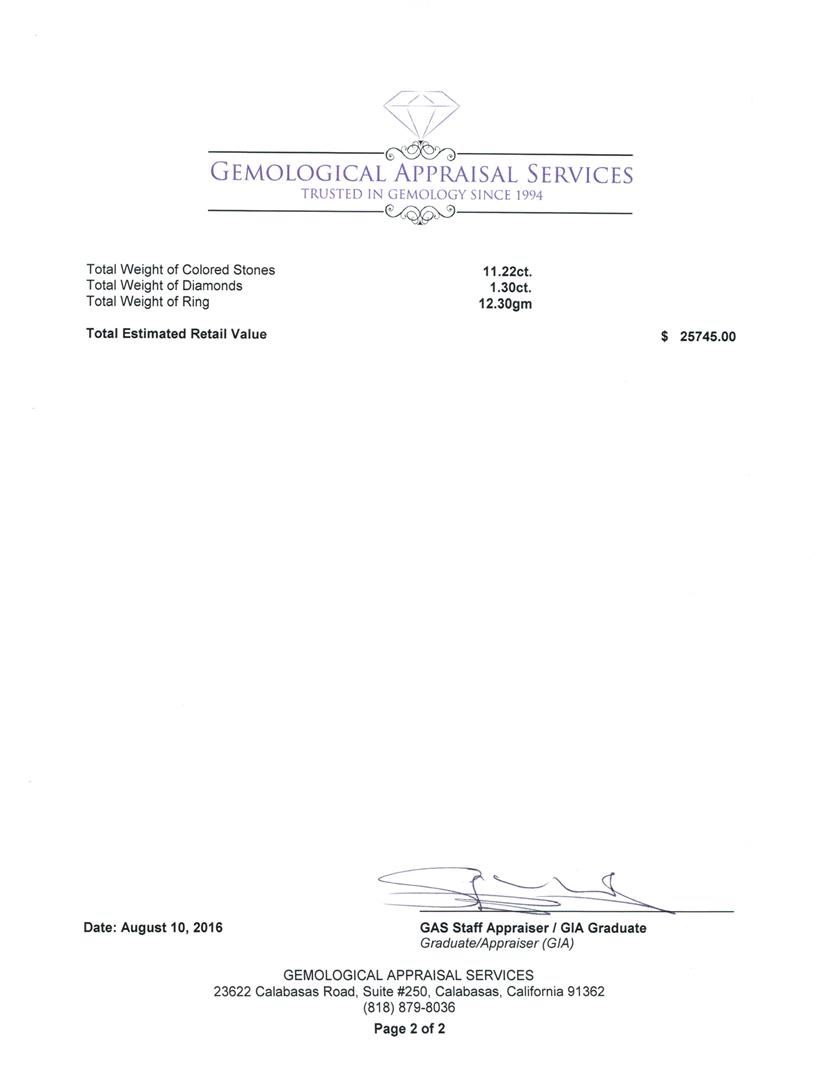 Not all Jewelry, watches or loose stones are appraised and the appraisals are provided for bidders only in certain instances at the discretion of SAA. Our appraisals are conducted by independent third-party appraisal firms. Such firms may be certified GIA Gemologists or have education in the industry or alternative certifications. Appraisals should be used for verification of gemstone and/or metal weight, size, and grade only, not actual value for resale or insurance purposes. Appraisal value should be not considered for actual value, as price varies greatly from retail locations and other merchants in different geographic locations. All Items auctioned by SAA should not be purchased with a view or expectation toward resale for appraisal price given, or to make a profit. The ultimate value for which an item can be resold may vary drastically from the appraisals listed by SAA.