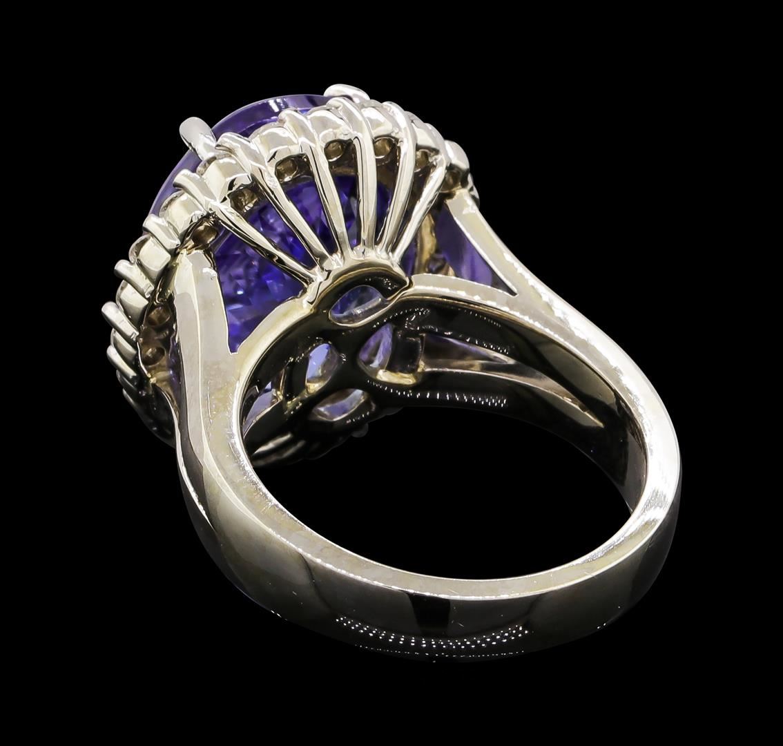 One electronically tested 14KT white gold lady's cast fashion ring with a split shank basket halo with a bright polish finish. The featured lady's ring has a shank measuring 3.90 millimeters wide. Identified with markings of '14K'. Condition is new, good workmanship. Containing: One prong set oval modified brilliant cut natural tanzanite, measuring 14.33 x 11.91 x 9.17mm, (depth est.) approximate weight of 11.27ct., clarity is eye clean, medium, very slightly grayish, violetish blue color, (GIA vB 5/3), cut is very good. Transmitting light with no distortion, transparent. Colored gemstones are presumed to have been subjected to commonly used enhancement processes. Graded loose prior to setting in the GIA Laboratory, Report #5172847707. Twenty-Two prong set round brilliant cut diamonds, measuring 2.10 - 2.00 x 1.27mm (depth est.) approximate total weight of 22 Stones = 0.72ct. Graded in the setting. Clarity SI-1 to SI-2. Color: G - I Cut Good. Total Weight of Colored Stones 11.27ct.. Total Weight of Diamonds 0.72ct.. Total Weight of Ring 12.30gm. GAS Appraised at $18,735.00.