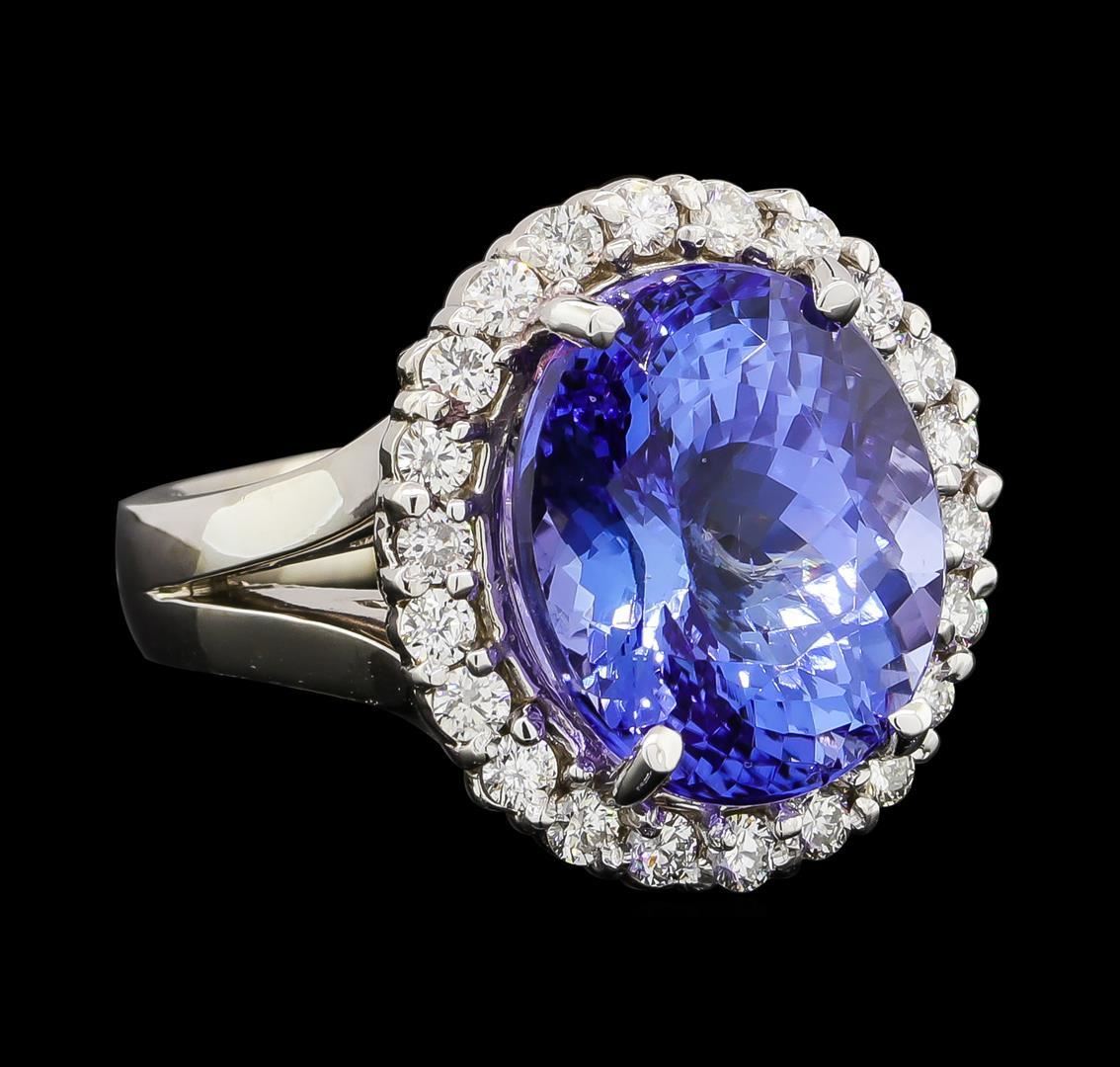 One electronically tested 14KT white gold lady's cast fashion ring with a split shank basket halo with a bright polish finish. The featured lady's ring has a shank measuring 3.90 millimeters wide. Identified with markings of '14K'. Condition is new, good workmanship. Containing: One prong set oval modified brilliant cut natural tanzanite, measuring 14.33 x 11.91 x 9.17mm, (depth est.) approximate weight of 11.27ct., clarity is eye clean, medium, very slightly grayish, violetish blue color, (GIA vB 5/3), cut is very good. Transmitting light with no distortion, transparent. Colored gemstones are presumed to have been subjected to commonly used enhancement processes. Graded loose prior to setting in the GIA Laboratory, Report #5172847707. Twenty-Two prong set round brilliant cut diamonds, measuring 2.10 - 2.00 x 1.27mm (depth est.) approximate total weight of 22 Stones = 0.72ct. Graded in the setting. Clarity SI-1 to SI-2. Color: G - I Cut Good. Total Weight of Colored Stones 11.27ct.. Total Weight of Diamonds 0.72ct.. Total Weight of Ring 12.30gm. GAS Appraised.