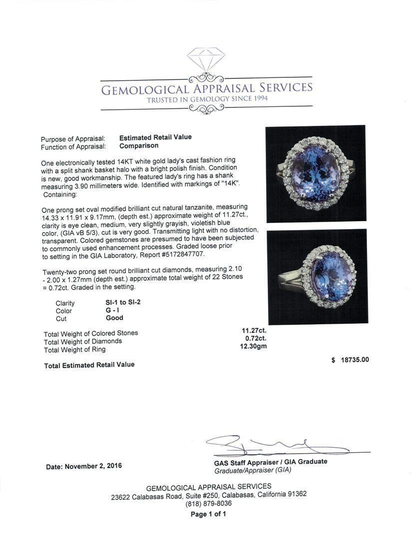 One electronically tested 14KT white gold lady's cast fashion ring with a split shank basket halo with a bright polish finish. The featured lady's ring has a shank measuring 3.90 millimeters wide. Identified with markings of '14K'. Condition is new, good workmanship. Containing: One prong set oval modified brilliant cut natural tanzanite, measuring 14.33 x 11.91 x 9.17mm, (depth est.) approximate weight of 11.27ct., clarity is eye clean, medium, very slightly grayish, violetish blue color, (GIA vB 5/3), cut is very good. Transmitting light with no distortion, transparent. Colored gemstones are presumed to have been subjected to commonly used enhancement processes. Graded loose prior to setting in the GIA Laboratory, Report #5172847707. Twenty-Two prong set round brilliant cut diamonds, measuring 2.10 - 2.00 x 1.27mm (depth est.) approximate total weight of 22 Stones = 0.72ct. Graded in the setting. Clarity SI-1 to SI-2. Color: G - I Cut Good. Total Weight of Colored Stones 11.27ct.. Total Weight of Diamonds 0.72ct.. Total Weight of Ring 12.30gm. GAS Appraised.