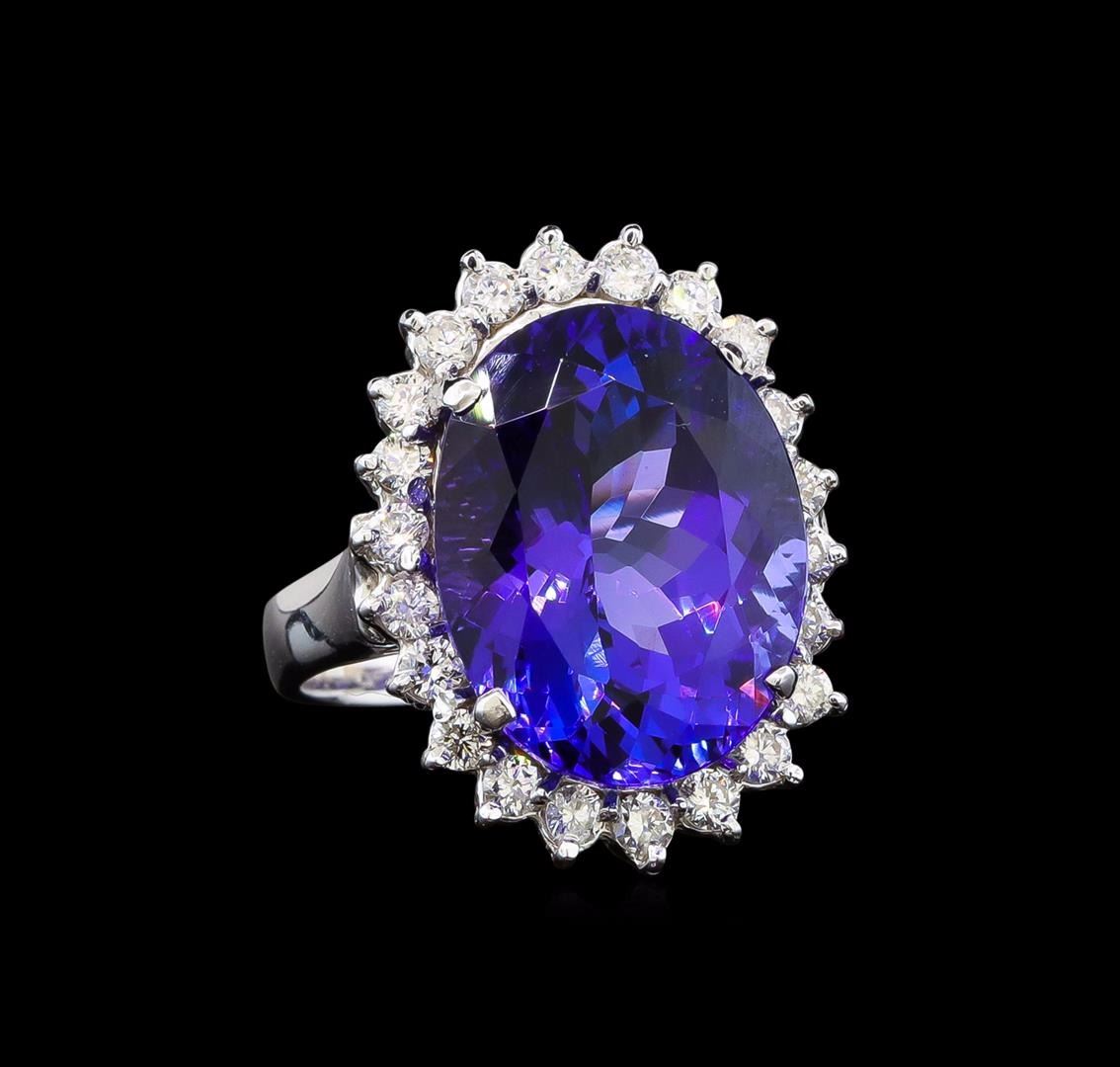 One electronically tested 14KT white gold lady's cast fashion ring with a basket halo with a bright polish finish. The featured lady's ring has a shank measuring 2.75 millimeters wide. Identified with markings of '14K'. Condition is new, good workmanship. Containing: One prong set oval modified brilliant cut natural tanzanite, measuring 16.19 x 12.51 x 8.39mm, (depth est.) approximate weight of 11.40ct., clarity is eye clean, medium dark, strong, violet color, (GIA V 6/5), cut is very good. Transmitting light with no distortion, transparent. Colored gemstones are presumed to have been subjected to commonly used enhancement processes. Graded loose prior to setting in the GIA Laboratory, Report #2171665709. Twenty-Two prong set round brilliant cut diamonds, measuring 2.30 - 2.25 x 1.41mm (depth est.) approximate total weight of 22 Stones = 0.98ct. Graded in the setting. Clarity SI-1 to I-1. Color: H - I Cut Good. Total Weight of Colored Stones 11.40ct.. Total Weight of Diamonds 0.98ct.. Total Weight of Ring 8.50gm. GAS Appraised at $19,915.00.