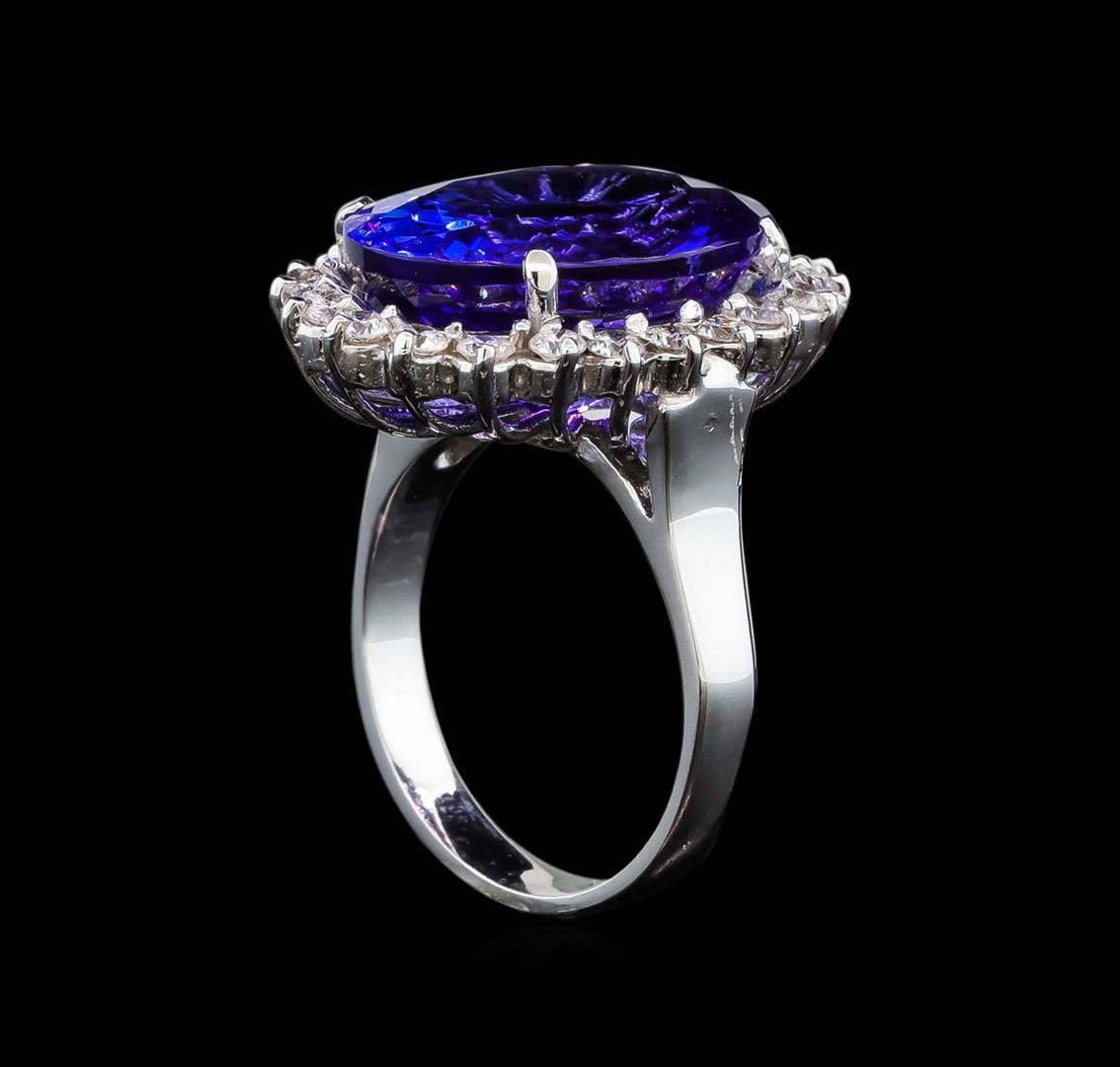 One electronically tested 14KT white gold lady's cast fashion ring with a basket halo with a bright polish finish. The featured lady's ring has a shank measuring 2.75 millimeters wide. Identified with markings of '14K'. Condition is new, good workmanship. Containing: One prong set oval modified brilliant cut natural tanzanite, measuring 16.19 x 12.51 x 8.39mm, (depth est.) approximate weight of 11.40ct., clarity is eye clean, medium dark, strong, violet color, (GIA V 6/5), cut is very good. Transmitting light with no distortion, transparent. Colored gemstones are presumed to have been subjected to commonly used enhancement processes. Graded loose prior to setting in the GIA Laboratory, Report #2171665709. Twenty-Two prong set round brilliant cut diamonds, measuring 2.30 - 2.25 x 1.41mm (depth est.) approximate total weight of 22 Stones = 0.98ct. Graded in the setting. Clarity SI-1 to I-1. Color: H - I Cut Good. Total Weight of Colored Stones 11.40ct.. Total Weight of Diamonds 0.98ct.. Total Weight of Ring 8.50gm. GAS Appraised at $19,915.00.