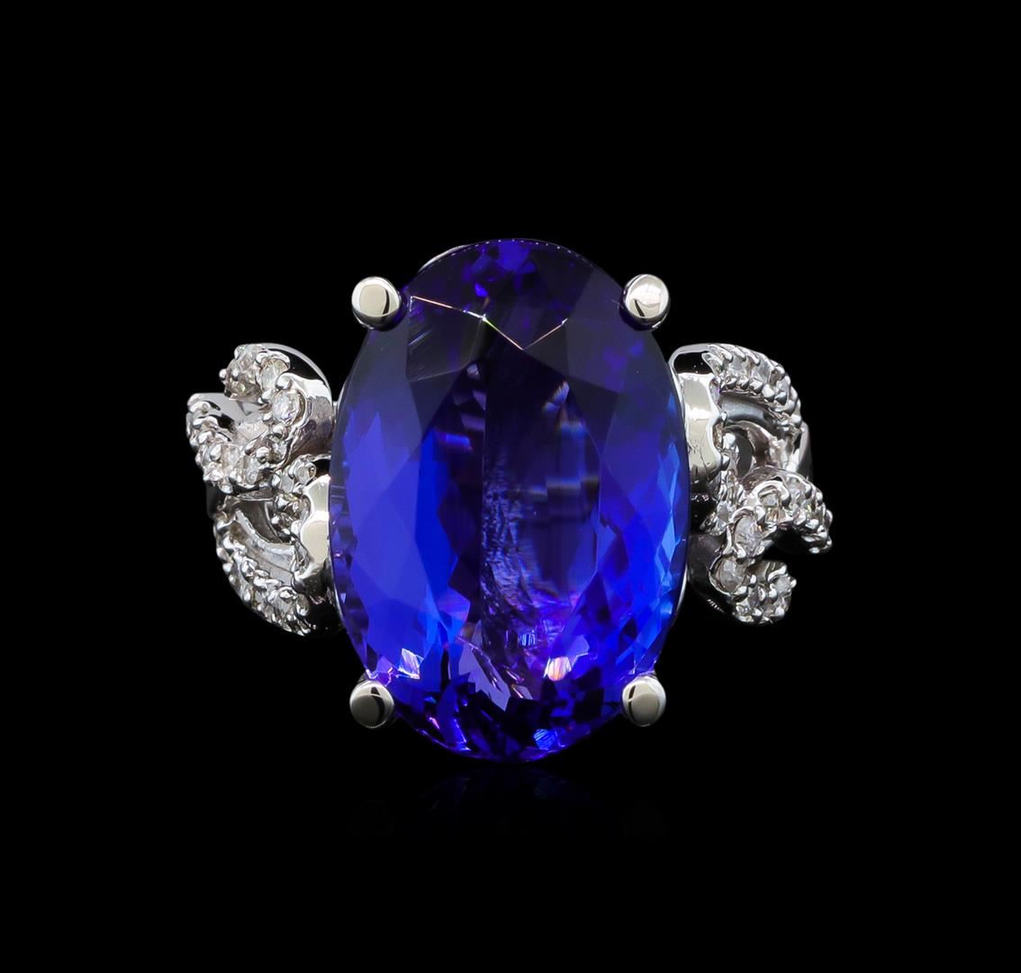 One electronically tested 14KT white gold lady's cast fashion ring with a scrolled cathedral shank with a bright polish finish. The featured lady's ring has a shank measuring 3.65 millimeters wide. Identified with markings of 'K14'. Condition is new, good workmanship. Containing: One prong set oval modified brilliant cut natural tanzanite, measuring 17.11 x 11.78 x 7.12mm, (depth est.) 13%. bulge factor, approximate weight of 11.49ct., clarity is eye clean, medium dark, moderately strong, bluish violet color, (GIA bV 6/4), cut is very good. Transmitting light with no distortion, transparent. Colored gemstones are presumed to have been subjected to commonly used enhancement processes. Graded loose prior to setting in the GIA Laboratory, Report #6177665626. Fifty-Four prong set round brilliant cut diamonds, measuring 1.35 - 1.25 x 0.81mm (depth est.) approximate total weight of 54 Stones = 0.45ct. Graded in the setting. Clarity SI-2 to I-2. Color: H - I Cut Good. Total Weight of Colored Stones 11.49ct.. Total Weight of Diamonds 0.45ct.. Total Weight of Ring 9.20gm. GAS Appraised at $22,690.00.