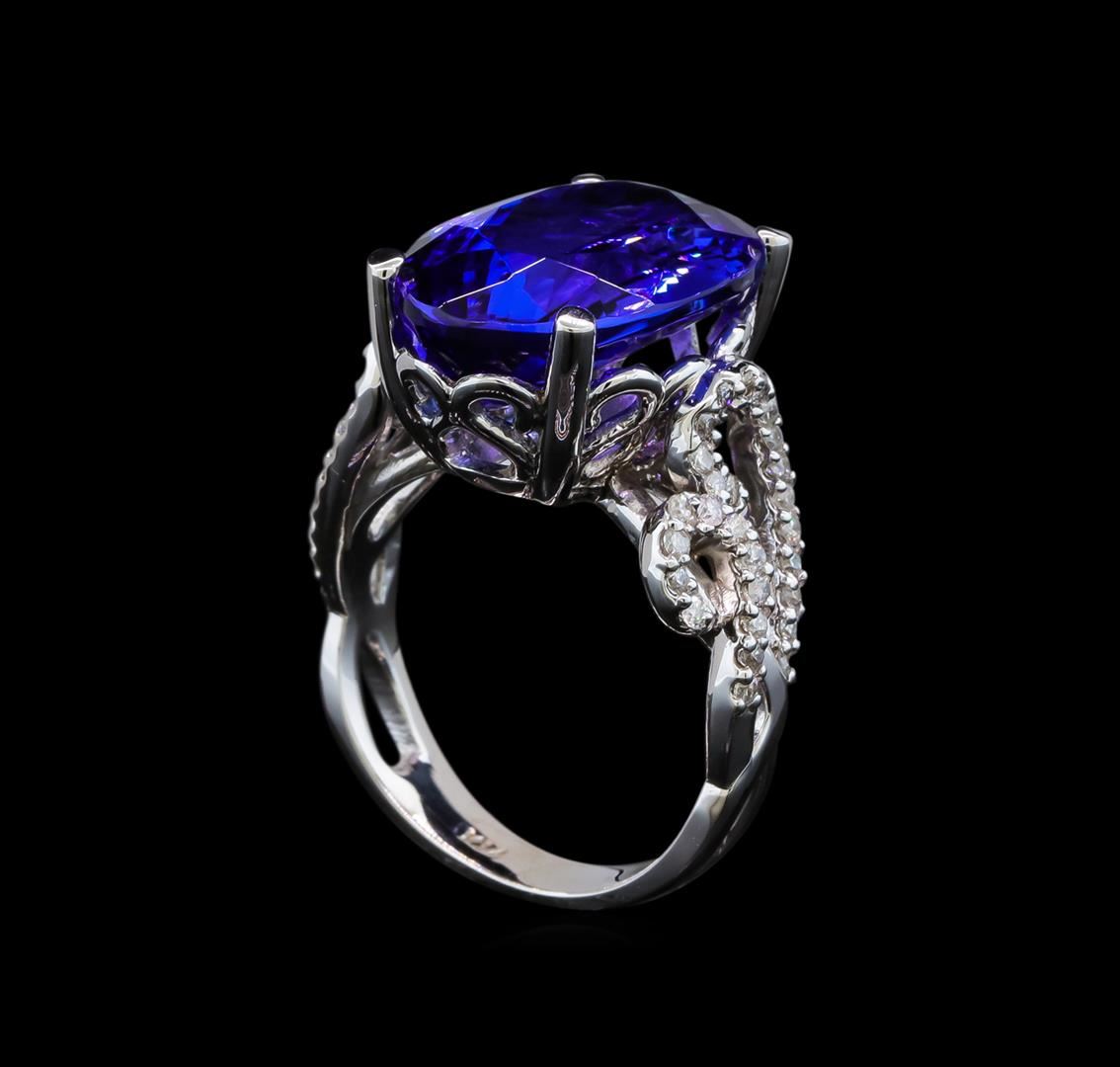 One electronically tested 14KT white gold lady's cast fashion ring with a scrolled cathedral shank with a bright polish finish. The featured lady's ring has a shank measuring 3.65 millimeters wide. Identified with markings of 'K14'. Condition is new, good workmanship. Containing: One prong set oval modified brilliant cut natural tanzanite, measuring 17.11 x 11.78 x 7.12mm, (depth est.) 13%. bulge factor, approximate weight of 11.49ct., clarity is eye clean, medium dark, moderately strong, bluish violet color, (GIA bV 6/4), cut is very good. Transmitting light with no distortion, transparent. Colored gemstones are presumed to have been subjected to commonly used enhancement processes. Graded loose prior to setting in the GIA Laboratory, Report #6177665626. Fifty-Four prong set round brilliant cut diamonds, measuring 1.35 - 1.25 x 0.81mm (depth est.) approximate total weight of 54 Stones = 0.45ct. Graded in the setting. Clarity SI-2 to I-2. Color: H - I Cut Good. Total Weight of Colored Stones 11.49ct.. Total Weight of Diamonds 0.45ct.. Total Weight of Ring 9.20gm. GAS Appraised at $22,690.00.