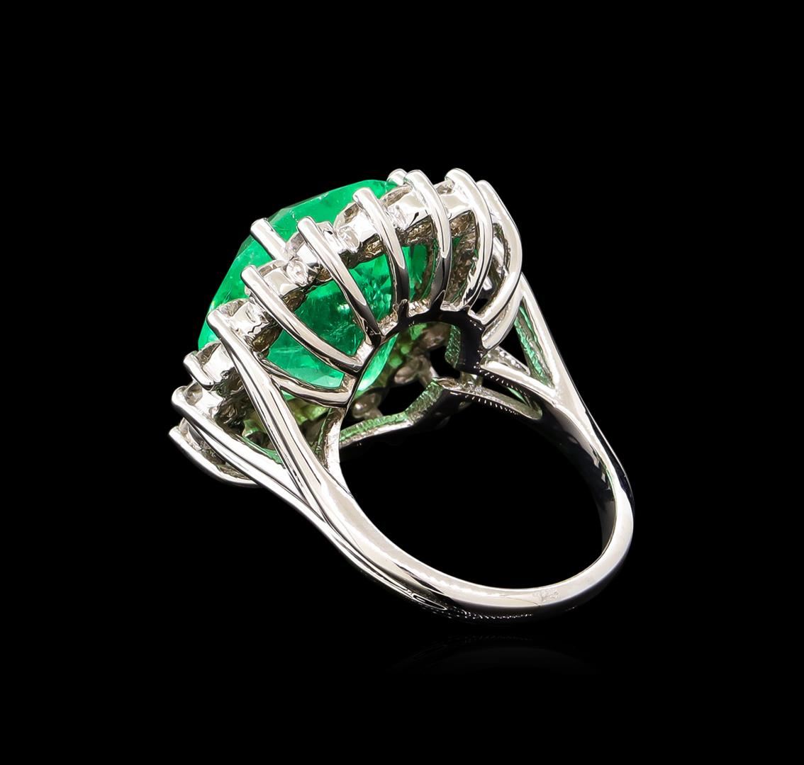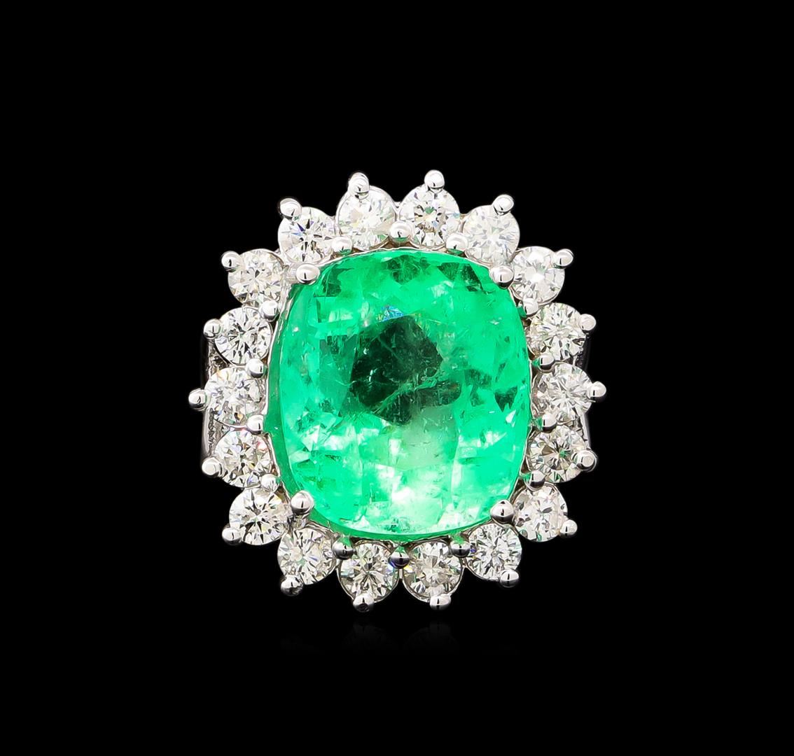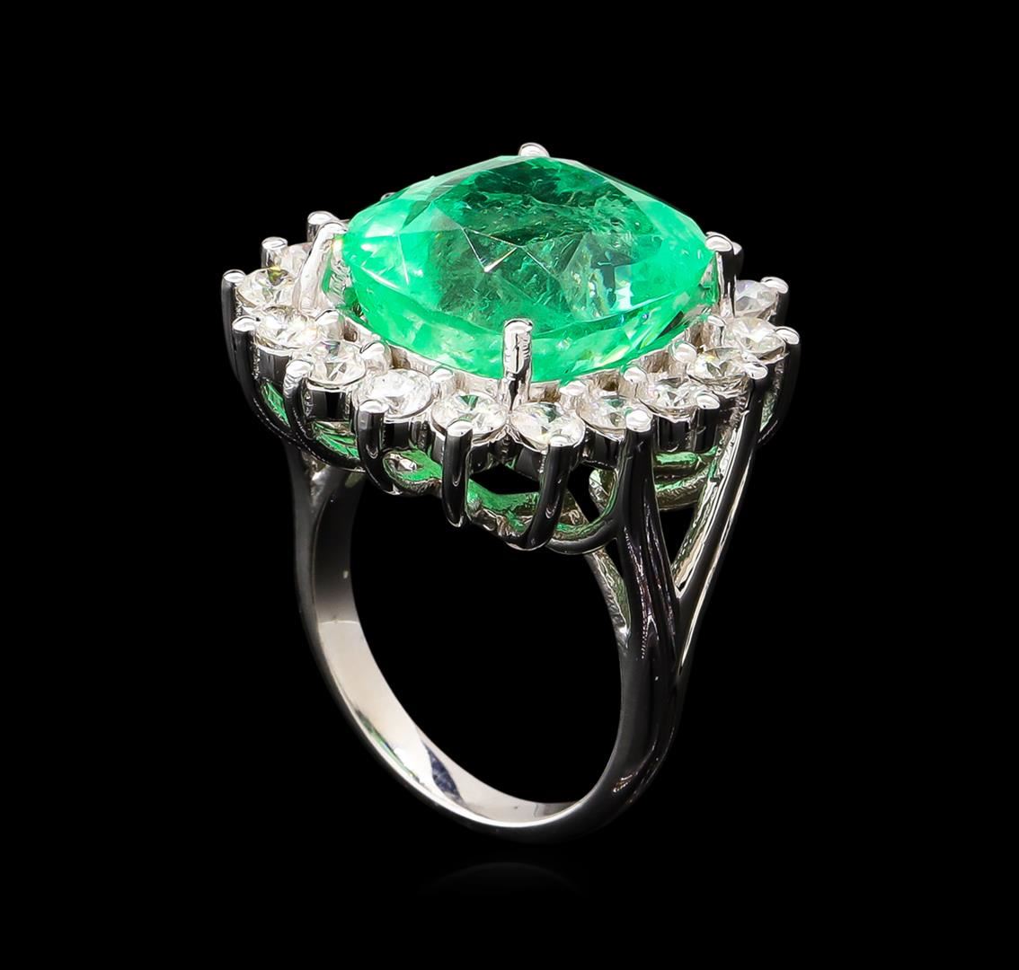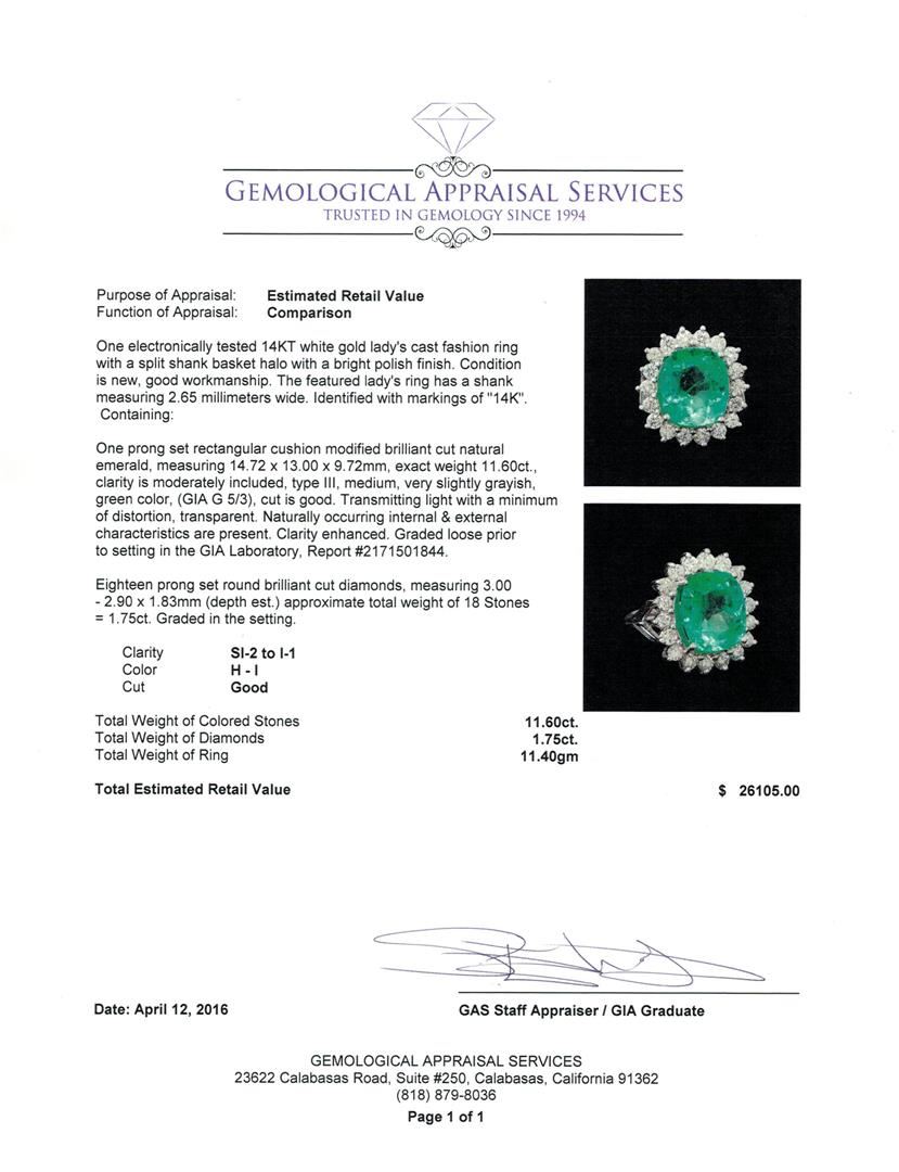 One electronically tested 14KT white gold lady's cast fashion ring with a split shank basket halo with a bright polish finish. The featured lady's ring has a shank measuring 2.65 millimeters wide. Identified with markings of "14K". Condition is new, good workmanship. Containing: One prong set rectangular cushion modified brilliant cut natural emerald, measuring 14.72 x 13.00 x 9.72mm, exact weight 11.60ct., clarity is moderately included, type III, medium, very slightly grayish, green color, (GIA G 5/3), cut is good. Transmitting light with a minimum of distortion, transparent. Naturally occurring internal & external characteristics are present. Clarity enhanced. Graded loose prior to setting in the GIA Laboratory, Report #2171501844.Eighteen prong set round brilliant cut diamonds, measuring 3.00 - 2.90 x 1.83mm (depth est.) approximate total weight of 18 Stones = 1.75ct. Graded in the setting. Clarity: SI-2 to I-1. Color: H - I. Cut Good. Total Weight of Colored Stones 11.60ct. Total Weight of Diamonds 1.75ct. Total Weight of Ring 11.40gm. GAS Appraised at $26,105.00.