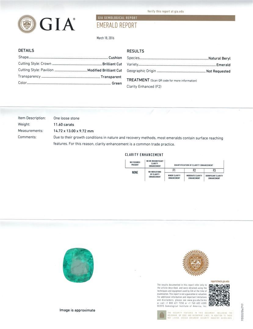 One electronically tested 14KT white gold lady's cast fashion ring with a split shank basket halo with a bright polish finish. The featured lady's ring has a shank measuring 2.65 millimeters wide. Identified with markings of "14K". Condition is new, good workmanship. Containing: One prong set rectangular cushion modified brilliant cut natural emerald, measuring 14.72 x 13.00 x 9.72mm, exact weight 11.60ct., clarity is moderately included, type III, medium, very slightly grayish, green color, (GIA G 5/3), cut is good. Transmitting light with a minimum of distortion, transparent. Naturally occurring internal & external characteristics are present. Clarity enhanced. Graded loose prior to setting in the GIA Laboratory, Report #2171501844.Eighteen prong set round brilliant cut diamonds, measuring 3.00 - 2.90 x 1.83mm (depth est.) approximate total weight of 18 Stones = 1.75ct. Graded in the setting. Clarity: SI-2 to I-1. Color: H - I. Cut Good. Total Weight of Colored Stones 11.60ct. Total Weight of Diamonds 1.75ct. Total Weight of Ring 11.40gm. GAS Appraised at $26,105.00.
