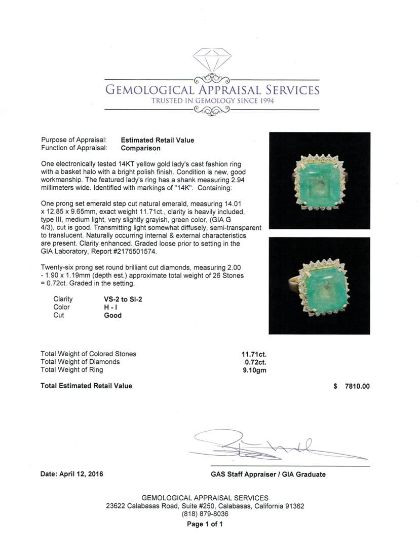One electronically tested 14KT yellow gold lady's cast fashion ring with a basket halo with a bright polish finish. The featured lady's ring has a shank measuring 2.94 millimeters wide. Identified with markings of "14K". Condition is new, good workmanship. Containing: One prong set emerald step cut natural emerald, measuring 14.01 x 12.85 x 9.65mm, exact weight 11.71ct., clarity is heavily included, type III, medium light, very slightly grayish, green color, (GIA G 4/3), cut is good. Transmitting light somewhat diffusely, semi-transparent to translucent. Naturally occurring internal & external characteristics are present. Clarity enhanced. Graded loose prior to setting in the GIA Laboratory, Report #2175501574.Twenty-Six prong set round brilliant cut diamonds, measuring 2.00 - 1.90 x 1.19mm (depth est.) approximate total weight of 26 Stones = 0.72ct. Graded in the setting. Clarity: VS-2 to SI-2. Color: H - I. Cut Good. Total Weight of Colored Stones 11.71ct. Total Weight of Diamonds 0.72ct. Total Weight of Ring 9.10gm. GAS Appraised at $7,810.00.