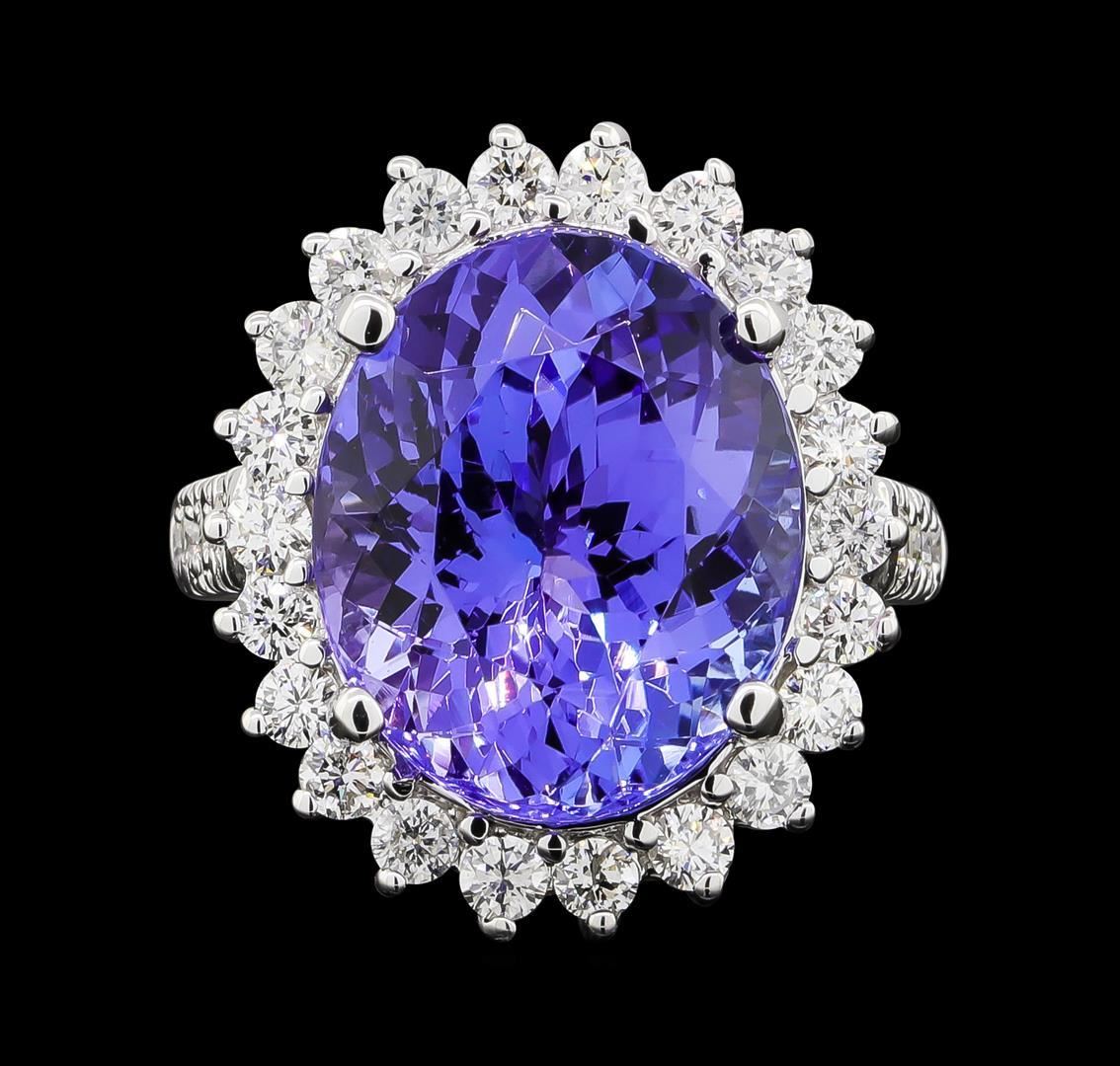 One electronically tested 14KT white gold lady's cast fashion ring with a basket halo with a bright polish finish. The featured lady's ring has a shank measuring 1.95 millimeters wide. Identified with markings of 'K14'. Condition is new, good workmanship. Containing: One prong set oval modified brilliant cut natural tanzanite, measuring 15.80 x 13.07 x 9.03mm, (depth est.) approximate weight of 11.78ct., clarity is eye clean, medium, moderately strong, violet color, (GIA V 5/4), cut is very good. Transmitting light with no distortion, transparent. Colored gemstones are presumed to have been subjected to commonly used enhancement processes. Graded loose prior to setting in the GIA Laboratory, Report #5171847699. Twenty-Two prong set round brilliant cut diamonds, measuring 2.40 - 2.30 x 1.46mm (depth est.) approximate total weight of 22 Stones = 1.08ct. Graded in the setting. Clarity SI-1 to SI-2. Color: G - H Cut Good Eight prong set round brilliant cut diamonds, measuring 2.00 - 1.90 x 1.17mm (depth est.) approximate total weight of 8 Stones = 0.22ct. Graded in the setting. Clarity SI-1 to SI-2. Color: G - I Cut Good. Total Weight of Colored Stones 11.78ct.. Total Weight of Diamonds 1.30 ct.. Total Weight of Ring 9.30gm. GAS Appraised.