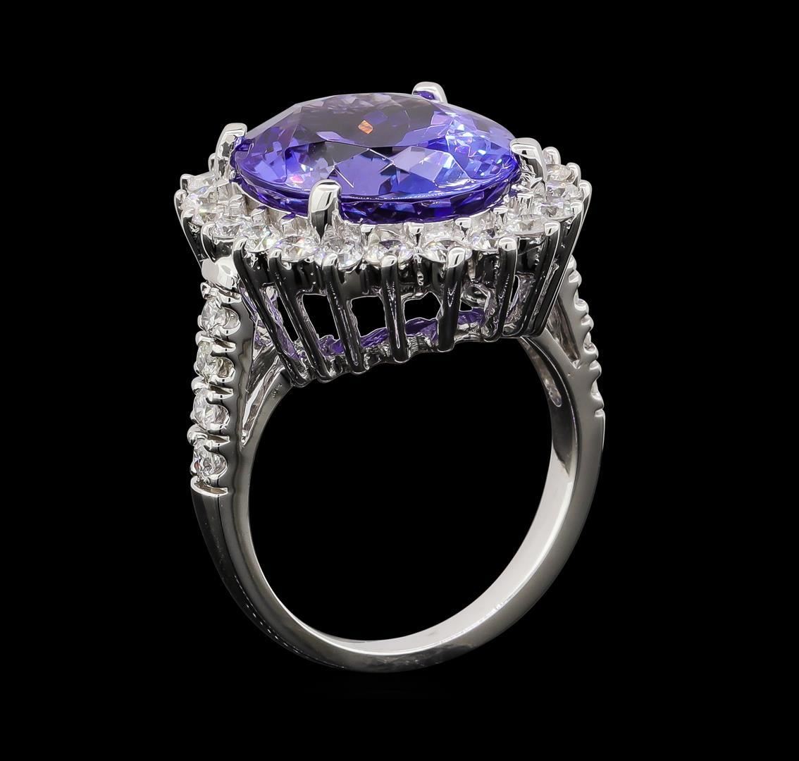 One electronically tested 14KT white gold lady's cast fashion ring with a basket halo with a bright polish finish. The featured lady's ring has a shank measuring 1.95 millimeters wide. Identified with markings of 'K14'. Condition is new, good workmanship. Containing: One prong set oval modified brilliant cut natural tanzanite, measuring 15.80 x 13.07 x 9.03mm, (depth est.) approximate weight of 11.78ct., clarity is eye clean, medium, moderately strong, violet color, (GIA V 5/4), cut is very good. Transmitting light with no distortion, transparent. Colored gemstones are presumed to have been subjected to commonly used enhancement processes. Graded loose prior to setting in the GIA Laboratory, Report #5171847699. Twenty-Two prong set round brilliant cut diamonds, measuring 2.40 - 2.30 x 1.46mm (depth est.) approximate total weight of 22 Stones = 1.08ct. Graded in the setting. Clarity SI-1 to SI-2. Color: G - H Cut Good Eight prong set round brilliant cut diamonds, measuring 2.00 - 1.90 x 1.17mm (depth est.) approximate total weight of 8 Stones = 0.22ct. Graded in the setting. Clarity SI-1 to SI-2. Color: G - I Cut Good. Total Weight of Colored Stones 11.78ct.. Total Weight of Diamonds 1.30 ct.. Total Weight of Ring 9.30gm. GAS Appraised.