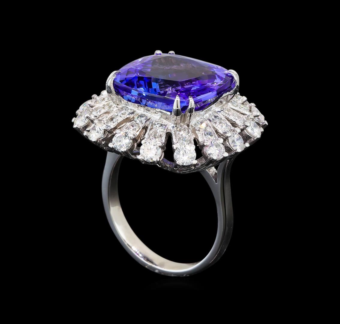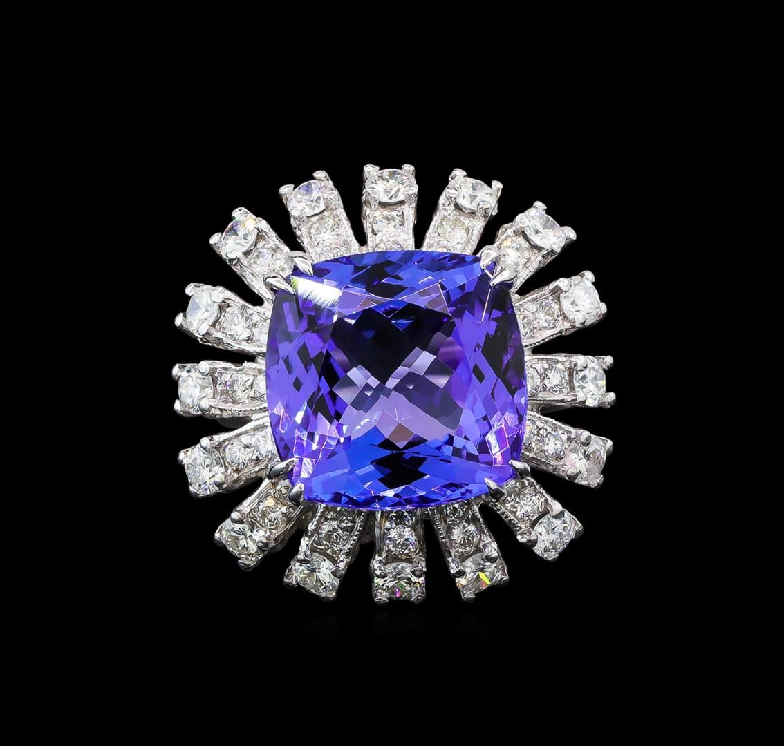 One electronically tested 14KT white gold lady's cast starburst design ring with a triple basket halo with a bright polish with milgrain detailing finish. The featured lady's ring has a shank measuring 2.73 millimeters wide. Identified with markings of 'K14'. Condition is new, good workmanship. Containing: One prong set square cushion modified brilliant cut natural tanzanite, measuring 13.81 x 13.75 x 7.60mm, (depth est.) 5%. bulge factor, approximate weight of 11.86ct., clarity is eye clean, medium, moderately strong, bluish violet color, (GIA bV 5/4), cut is very good. Transmitting light with no distortion, transparent. Colored gemstones are presumed to have been subjected to commonly used enhancement processes. Graded loose prior to setting in the GIA Laboratory, Report #5171668339. Sixteen prong set round brilliant cut diamonds, measuring 2.70 - 2.60 x 1.64mm (depth est.) approximate total weight of 16 Stones = 1.12ct. Graded in the setting. Clarity SI-1 to SI-2. Color: H - I Cut Good Thirty-Two prong set round brilliant cut diamonds, measuring 1.80 - 1.70 x 1.09mm (depth est.) approximate total weight of 32 Stones = 0.65ct. Graded in the setting. Clarity SI-1 to SI-2. Color: G - I Cut Good. Total Weight of Colored Stones 11.86ct.. Total Weight of Diamonds 1.77ct.. Total Weight of Ring 9.70gm. GAS Appraised at $24,845.00.