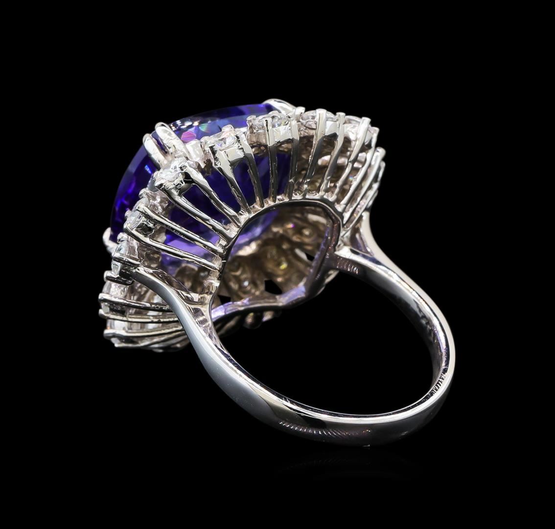 One electronically tested 14KT white gold lady's cast starburst design ring with a triple basket halo with a bright polish with milgrain detailing finish. The featured lady's ring has a shank measuring 2.73 millimeters wide. Identified with markings of 'K14'. Condition is new, good workmanship. Containing: One prong set square cushion modified brilliant cut natural tanzanite, measuring 13.81 x 13.75 x 7.60mm, (depth est.) 5%. bulge factor, approximate weight of 11.86ct., clarity is eye clean, medium, moderately strong, bluish violet color, (GIA bV 5/4), cut is very good. Transmitting light with no distortion, transparent. Colored gemstones are presumed to have been subjected to commonly used enhancement processes. Graded loose prior to setting in the GIA Laboratory, Report #5171668339. Sixteen prong set round brilliant cut diamonds, measuring 2.70 - 2.60 x 1.64mm (depth est.) approximate total weight of 16 Stones = 1.12ct. Graded in the setting. Clarity SI-1 to SI-2. Color: H - I Cut Good Thirty-Two prong set round brilliant cut diamonds, measuring 1.80 - 1.70 x 1.09mm (depth est.) approximate total weight of 32 Stones = 0.65ct. Graded in the setting. Clarity SI-1 to SI-2. Color: G - I Cut Good. Total Weight of Colored Stones 11.86ct.. Total Weight of Diamonds 1.77ct.. Total Weight of Ring 9.70gm. GAS Appraised at $24,845.00.