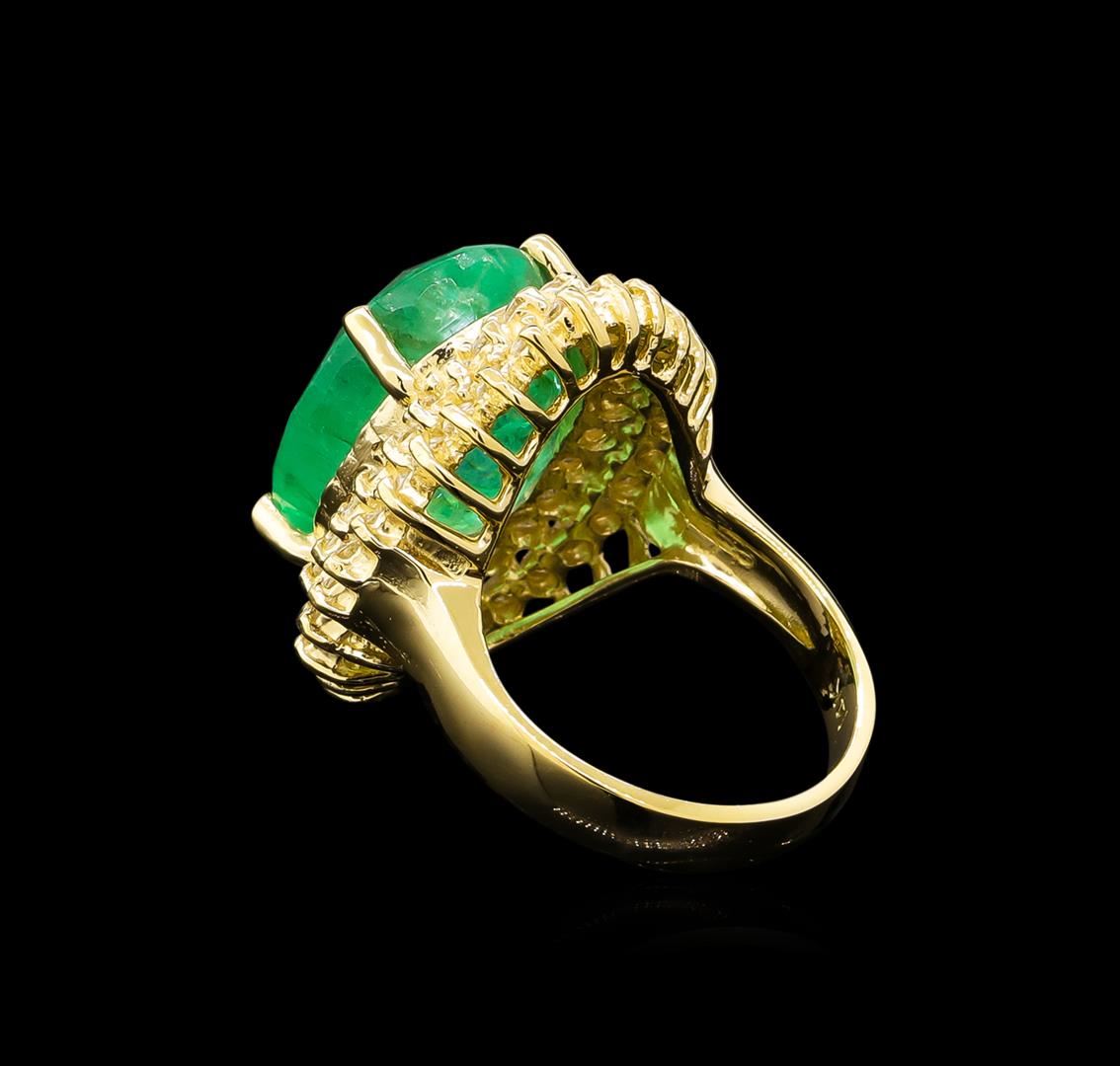 One electronically tested 14KT yellow gold lady's cast fashion ring with a double basket halo with a bright polish finish. The featured lady's ring has a shank measuring 3.40 millimeters wide. Identified with markings of "14K". Condition is new, good workmanship. Containing: One prong set oval modified brilliant cut natural emerald, measuring 16.02 x 12.26 x 9.07mm, 17%. bulge factor, exact weight 11.91ct., clarity is moderately included, type III, medium, very slightly grayish, green color, (GIA G 5/3), cut is good. Transmitting light somewhat diffusely, transparent to translucent. Naturally occurring internal & external characteristics are present. Clarity enhanced. Graded loose prior to setting in the GIA Laboratory, Report #5172501508.Fifty-Six prong set round brilliant cut diamonds, measuring 1.70 - 1.60 x 1.02mm (depth est.) approximate total weight of 56 Stones = 0.95ct. Graded in the setting. Clarity: SI-1 to SI-2. Color: H - I. Cut Good. Total Weight of Colored Stones 11.91ct. Total Weight of Diamonds 0.95ct. Total Weight of Ring 9.70gm. GAS Appraised at $25,485.00.