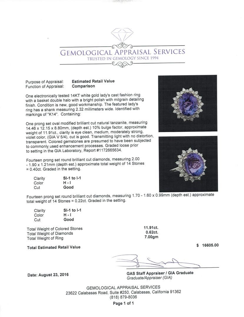 One electronically tested 14KT white gold lady's cast fashion ring with a basket double halo with a bright polish with milgrain detailing finish. The featured lady's ring has a shank measuring 2.32 millimeters wide. Identified with markings of 'K14'. Condition is new, good workmanship. Containing: One prong set oval modified brilliant cut natural tanzanite, measuring 14.46 x 12.15 x 8.80mm, (depth est.) 10%. bulge factor, approximate weight of 11.91ct., clarity is eye clean, medium, moderately strong, violet color, (GIA V 5/4), cut is good. Transmitting light with no distortion, transparent. Colored gemstones are presumed to have been subjected to commonly used enhancement processes. Graded loose prior to setting in the GIA Laboratory, Report #1172665634. Fourteen prong set round brilliant cut diamonds, measuring 2.00 - 1.90 x 1.21mm (depth est.) approximate total weight of 14 Stones = 0.40ct. Graded in the setting. Clarity SI-1 to I-1. Color: H - I Cut Good Fourteen prong set round brilliant cut diamonds, measuring 1.70 - 1.60 x 0.99mm (depth est.) approximate total weight of 14 Stones = 0.22ct. Graded in the setting. Clarity SI-1 to I-1. Color: H - I Cut Good. Total Weight of Colored Stones 11.91ct.. Total Weight of Diamonds 0.62ct.. Total Weight of Ring 7.00gm. GAS Appraised at $16,605.00.