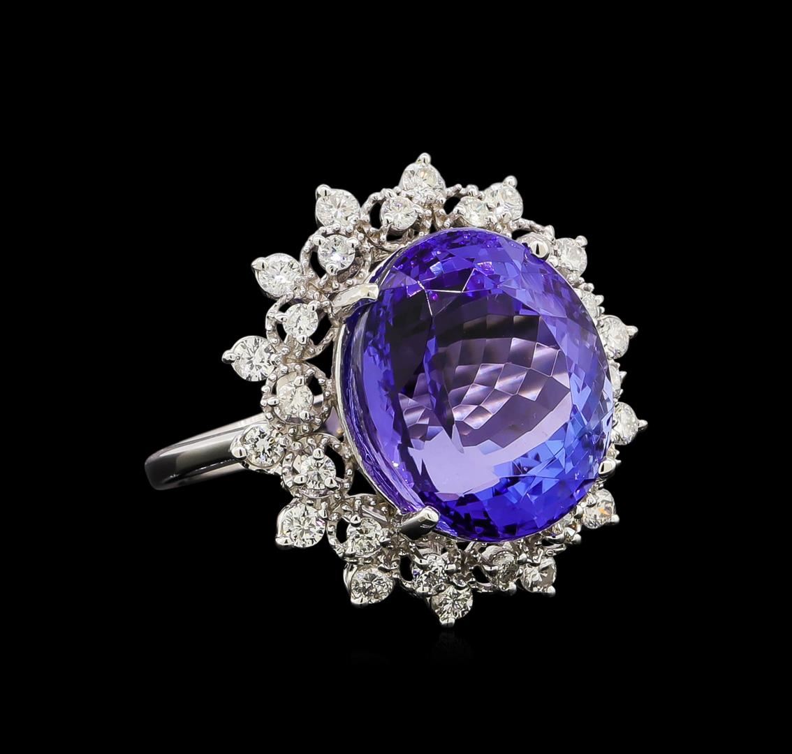 One electronically tested 14KT white gold lady's cast fashion ring with a basket double halo with a bright polish with milgrain detailing finish. The featured lady's ring has a shank measuring 2.32 millimeters wide. Identified with markings of 'K14'. Condition is new, good workmanship. Containing: One prong set oval modified brilliant cut natural tanzanite, measuring 14.46 x 12.15 x 8.80mm, (depth est.) 10%. bulge factor, approximate weight of 11.91ct., clarity is eye clean, medium, moderately strong, violet color, (GIA V 5/4), cut is good. Transmitting light with no distortion, transparent. Colored gemstones are presumed to have been subjected to commonly used enhancement processes. Graded loose prior to setting in the GIA Laboratory, Report #1172665634. Fourteen prong set round brilliant cut diamonds, measuring 2.00 - 1.90 x 1.21mm (depth est.) approximate total weight of 14 Stones = 0.40ct. Graded in the setting. Clarity SI-1 to I-1. Color: H - I Cut Good Fourteen prong set round brilliant cut diamonds, measuring 1.70 - 1.60 x 0.99mm (depth est.) approximate total weight of 14 Stones = 0.22ct. Graded in the setting. Clarity SI-1 to I-1. Color: H - I Cut Good. Total Weight of Colored Stones 11.91ct.. Total Weight of Diamonds 0.62ct.. Total Weight of Ring 7.00gm. GAS Appraised at $16,605.00.