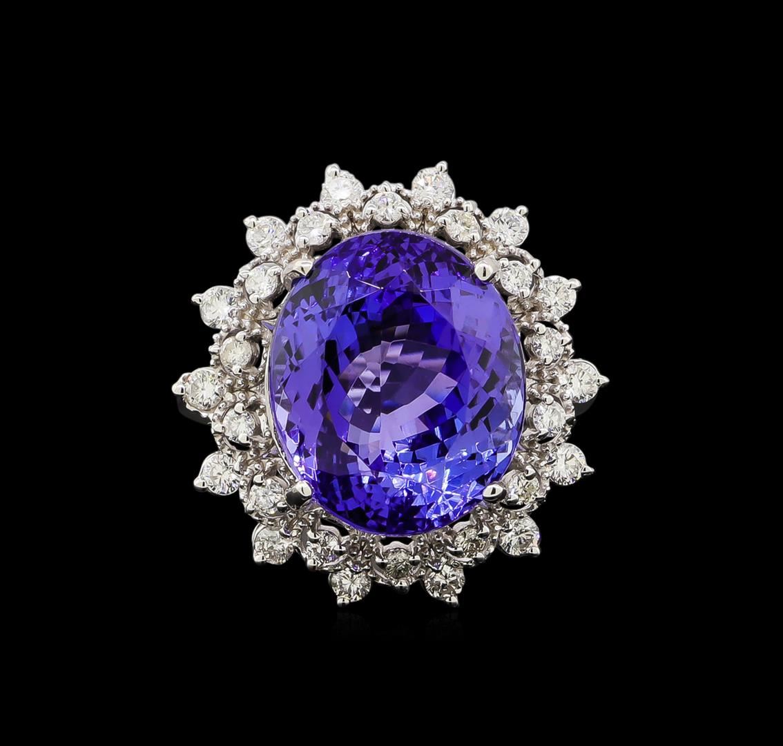 One electronically tested 14KT white gold lady's cast fashion ring with a basket double halo with a bright polish with milgrain detailing finish. The featured lady's ring has a shank measuring 2.32 millimeters wide. Identified with markings of 'K14'. Condition is new, good workmanship. Containing: One prong set oval modified brilliant cut natural tanzanite, measuring 14.46 x 12.15 x 8.80mm, (depth est.) 10%. bulge factor, approximate weight of 11.91ct., clarity is eye clean, medium, moderately strong, violet color, (GIA V 5/4), cut is good. Transmitting light with no distortion, transparent. Colored gemstones are presumed to have been subjected to commonly used enhancement processes. Graded loose prior to setting in the GIA Laboratory, Report #1172665634. Fourteen prong set round brilliant cut diamonds, measuring 2.00 - 1.90 x 1.21mm (depth est.) approximate total weight of 14 Stones = 0.40ct. Graded in the setting. Clarity SI-1 to I-1. Color: H - I Cut Good Fourteen prong set round brilliant cut diamonds, measuring 1.70 - 1.60 x 0.99mm (depth est.) approximate total weight of 14 Stones = 0.22ct. Graded in the setting. Clarity SI-1 to I-1. Color: H - I Cut Good. Total Weight of Colored Stones 11.91ct.. Total Weight of Diamonds 0.62ct.. Total Weight of Ring 7.00gm. GAS Appraised at $16,605.00.