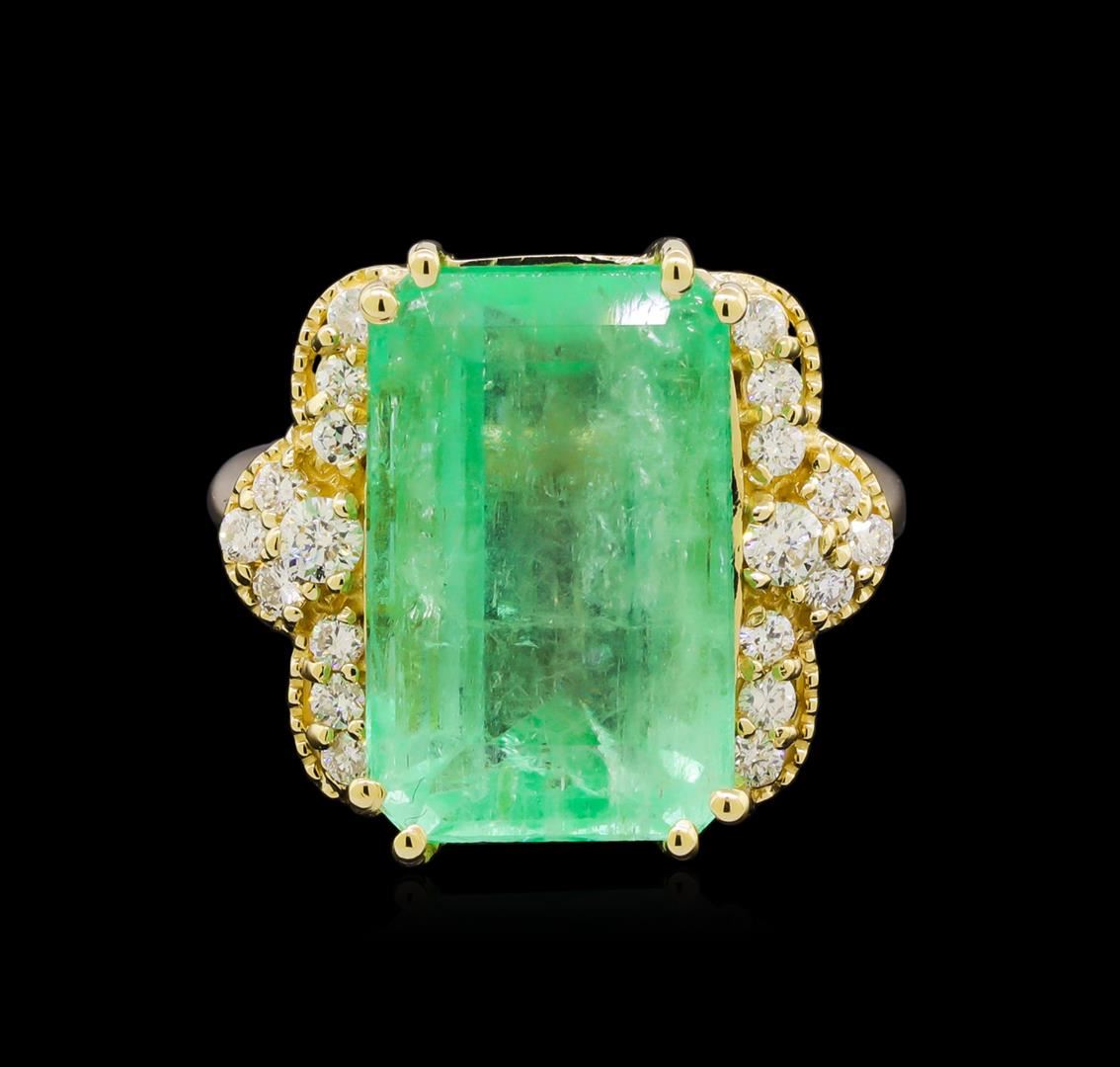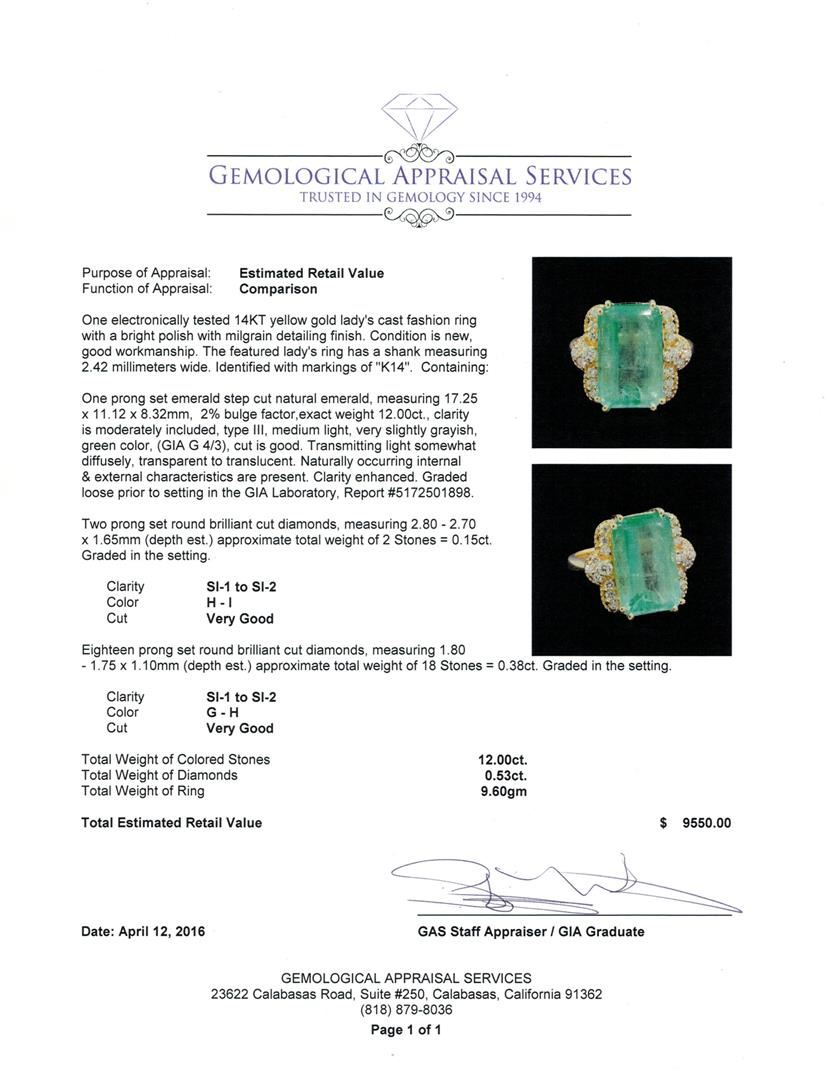 One electronically tested 14KT yellow gold lady's cast fashion ring with a bright polish with milgrain detailing finish. The featured lady's ring has a shank measuring 2.42 millimeters wide. Identified with markings of "K14". Condition is new, good workmanship. Containing: One prong set emerald step cut natural emerald, measuring 17.25 x 11.12 x 8.32mm, 2%. bulge factor, exact weight 12.00ct., clarity is moderately included, type III, medium light, very slightly grayish, green color, (GIA G 4/3), cut is good. Transmitting light somewhat diffusely, transparent to translucent. Naturally occurring internal & external characteristics are present. Clarity enhanced. Graded loose prior to setting in the GIA Laboratory, Report #5172501898.Two prong set round brilliant cut diamonds, measuring 2.80 - 2.70 x 1.65mm (depth est.) approximate total weight of 2 Stones = 0.15ct. Graded in the setting. Clarity: SI-1 to SI-2. Color: H - I. Cut Very Good Eighteen prong set round brilliant cut diamonds, measuring 1.80 - 1.75 x 1.10mm (depth est.) approximate total weight of 18 Stones = 0.38ct. Graded in the setting. Clarity: SI-1 to SI-2. Color: G - Very Good. Total Weight of Colored Stones 12.00ct. Total Weight of Diamonds 0.53ct. Total Weight of Ring 9.60gm. GAS Appraised at $9,550.00.