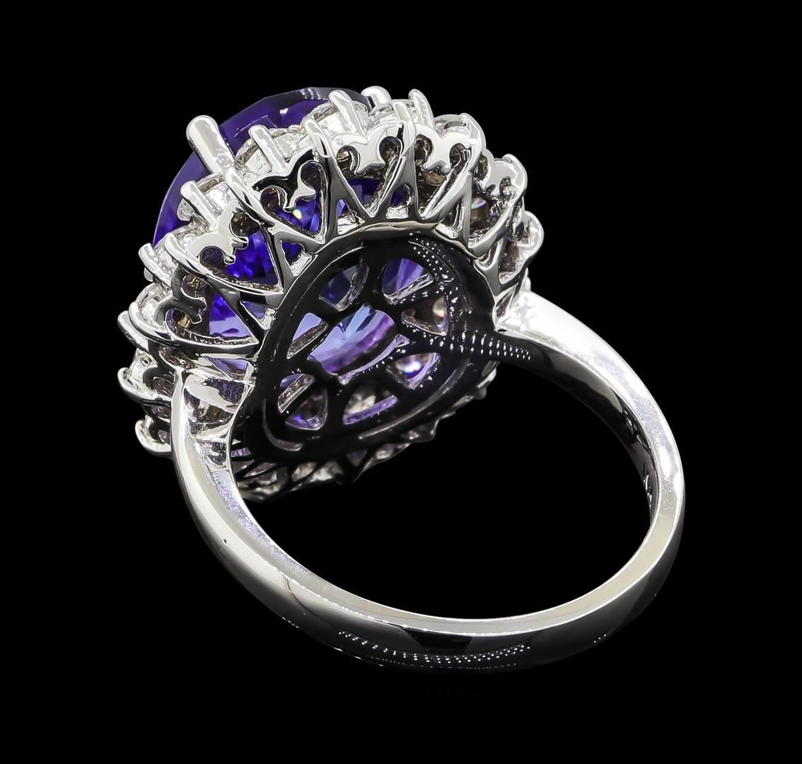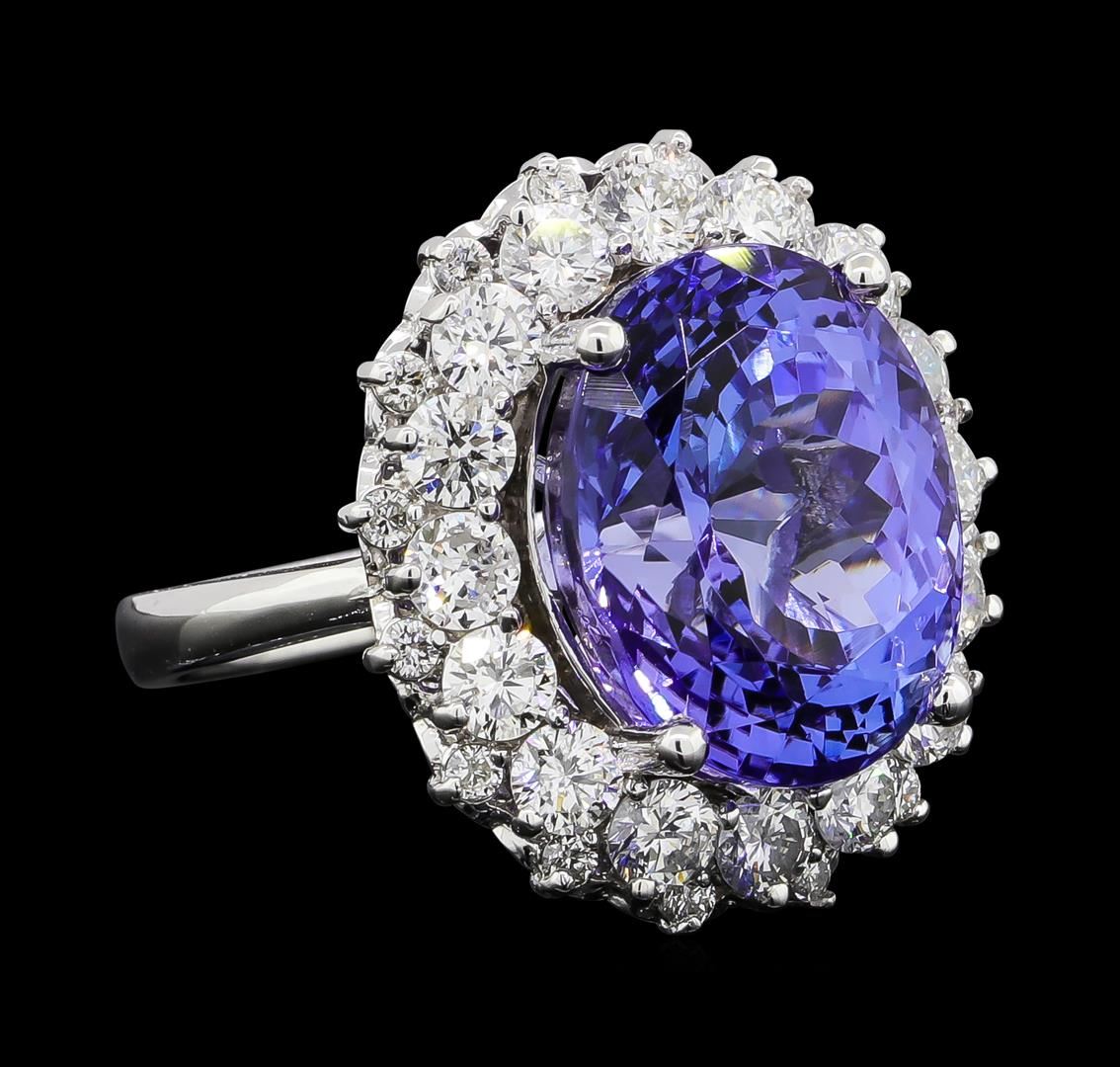 One electronically tested 14KT white gold lady's cast fashion ring with a basket double halo with a bright polish finish. The featured lady's ring has a shank measuring 2.69 millimeters wide. Identified with markings of '14K'. Condition is new, good workmanship. Containing: One prong set oval modified brilliant cut natural tanzanite, measuring 14.46 x 11.44 x 9.73mm, (depth est.) 6%. bulge factor, approximate weight of 12.06ct., clarity is eye clean, medium, very slightly grayish, bluish violet color, (GIA bV 5/3), cut is very good. Transmitting light with no distortion, transparent. Colored gemstones are presumed to have been subjected to commonly used enhancement processes. Graded loose prior to setting in the GIA Laboratory, Report #5171847682. Sixteen prong set round brilliant cut diamonds, measuring 3.10 - 3.00 x 1.89mm (depth est.) approximate total weight of 16 Stones = 1.75ct. Graded in the setting. Clarity SI-1 to SI-2. Color: G - H Cut Good Sixteen prong set round brilliant cut diamonds, measuring 1.60 - 1.50 x 0.96mm (depth est.) approximate total weight of 16 Stones = 0.23ct. Graded in the setting. Clarity SI-1 to SI-2. Color: G - H Cut Good. Total Weight of Colored Stones 12.06ct.. Total Weight of Diamonds 1.98ct.. Total Weight of Ring 9.50gm. GAS Appraised at $21,505.00.