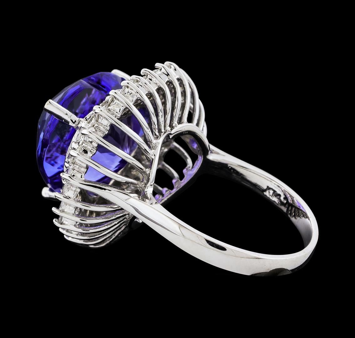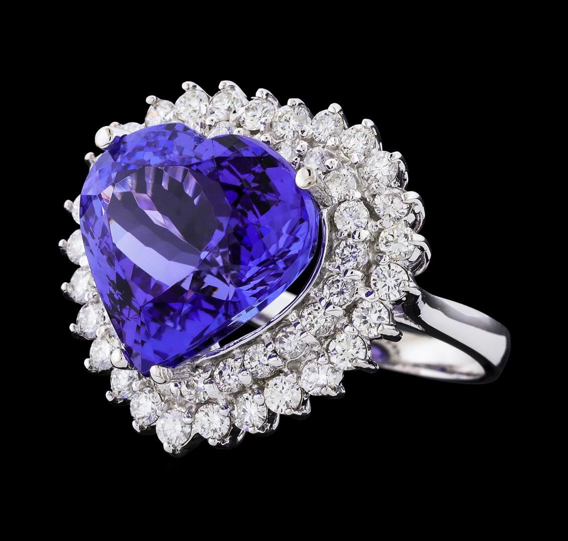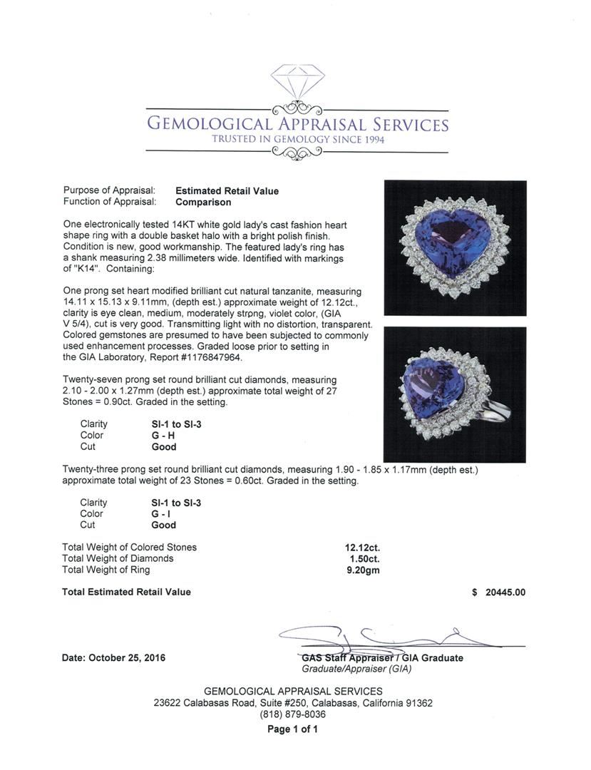 One electronically tested 14KT white gold lady's cast fashion heart shape ring with a double basket halo with a bright polish finish. The featured lady's ring has a shank measuring 2.38 millimeters wide. Identified with markings of 'K14'. Condition is new, good workmanship. Containing: One prong set heart modified brilliant cut natural tanzanite, measuring 14.11 x 15.13 x 9.11mm, (depth est.) approximate weight of 12.12ct., clarity is eye clean, medium, moderately strong, violet color, (GIA V 5/4), cut is very good. Transmitting light with no distortion, transparent. Colored gemstones are presumed to have been subjected to commonly used enhancement processes. Graded loose prior to setting in the GIA Laboratory, Report #1176847964. Twenty-Seven prong set round brilliant cut diamonds, measuring 2.10 - 2.00 x 1.27mm (depth est.) approximate total weight of 27 Stones = 0.90ct. Graded in the setting. Clarity SI-1 to SI-3. Color: G - H Cut Good Twenty-Three prong set round brilliant cut diamonds, measuring 1.90 - 1.85 x 1.17mm (depth est.) approximate total weight of 23 Stones = 0.60ct. Graded in the setting. Clarity SI-1 to SI-3. Color: G - I Cut Good. Total Weight of Colored Stones 12.12ct.. Total Weight of Diamonds 1.50ct.. Total Weight of Ring 9.20gm. GAS Appraised at $20,445.00.