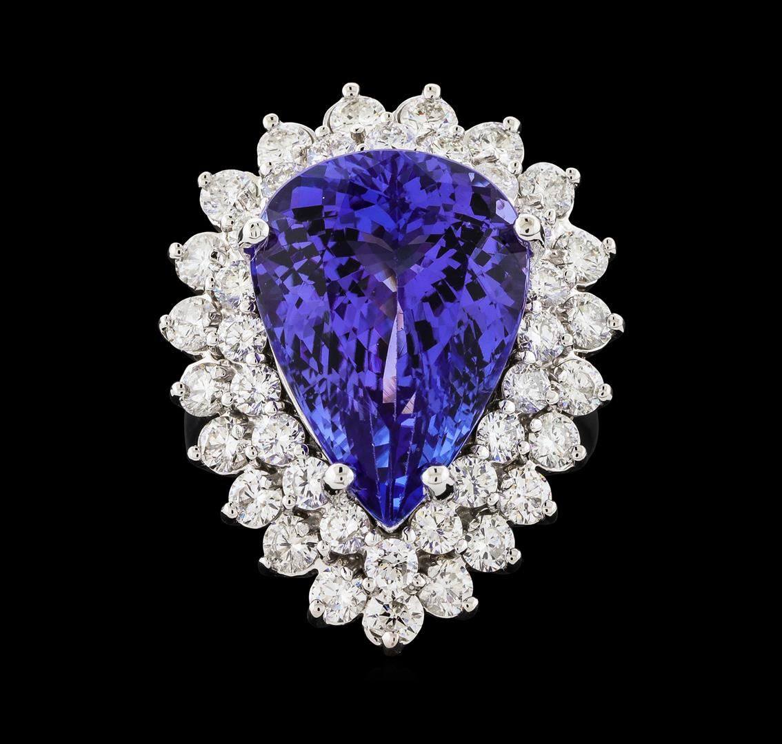 One electronically tested 14KT white gold lady's cast fashion ring with a double basket halo with a bright polish finish. The featured lady's ring has a shank measuring 2.23 millimeters wide. Identified with markings of 'K14'. Condition is new, good workmanship. Containing: One prong set pear modified brilliant cut natural tanzanite, measuring 18.17 x 12.98 x 8.44mm, (depth est.) approximate weight of 12.13ct., clarity is eye clean, medium, moderately strong, violet color, (GIA V 5/4), cut is very good. Transmitting light with no distortion, transparent. Colored gemstones are presumed to have been subjected to commonly used enhancement processes. Graded loose prior to setting in the GIA Laboratory, Report #2175847887. Twenty-One prong set round brilliant cut diamonds, measuring 2.80 - 2.75 x 1.72mm (depth est.) approximate total weight of 21 Stones = 1.68ct. Graded in the setting. Clarity SI-1 to I-1. Color: G - I Cut Good Twenty prong set round brilliant cut diamonds, measuring 2.40 - 2.30 x 1.41mm (depth est.) approximate total weight of 20 Stones = 0.95ct. Graded in the setting. Clarity SI-1 to SI-2. Color: H - I Cut Good. Total Weight of Colored Stones 12.13ct.. Total Weight of Diamonds 2.63ct.. Total Weight of Ring 12.50gm. GAS Appraised at $22,675.00.