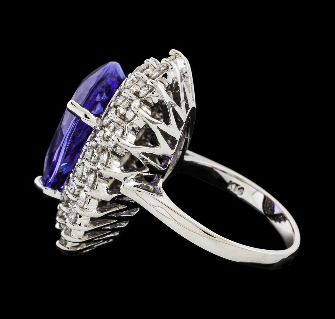 One electronically tested 14KT white gold lady's cast fashion ring with a double basket halo with a bright polish finish. The featured lady's ring has a shank measuring 2.23 millimeters wide. Identified with markings of 'K14'. Condition is new, good workmanship. Containing: One prong set pear modified brilliant cut natural tanzanite, measuring 18.17 x 12.98 x 8.44mm, (depth est.) approximate weight of 12.13ct., clarity is eye clean, medium, moderately strong, violet color, (GIA V 5/4), cut is very good. Transmitting light with no distortion, transparent. Colored gemstones are presumed to have been subjected to commonly used enhancement processes. Graded loose prior to setting in the GIA Laboratory, Report #2175847887. Twenty-One prong set round brilliant cut diamonds, measuring 2.80 - 2.75 x 1.72mm (depth est.) approximate total weight of 21 Stones = 1.68ct. Graded in the setting. Clarity SI-1 to I-1. Color: G - I Cut Good Twenty prong set round brilliant cut diamonds, measuring 2.40 - 2.30 x 1.41mm (depth est.) approximate total weight of 20 Stones = 0.95ct. Graded in the setting. Clarity SI-1 to SI-2. Color: H - I Cut Good. Total Weight of Colored Stones 12.13ct.. Total Weight of Diamonds 2.63ct.. Total Weight of Ring 12.50gm. GAS Appraised at $22,675.00.