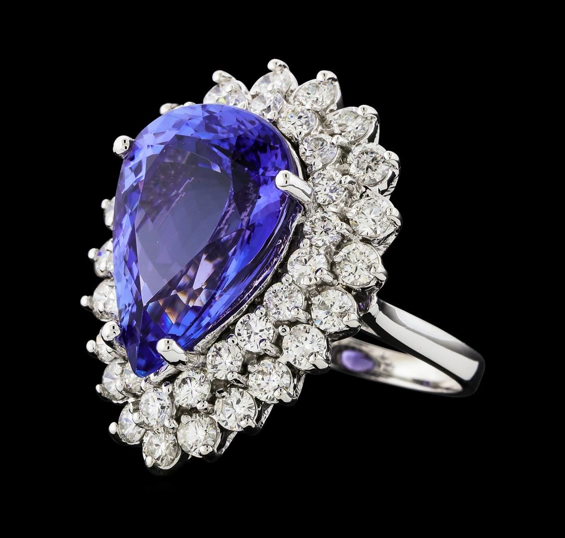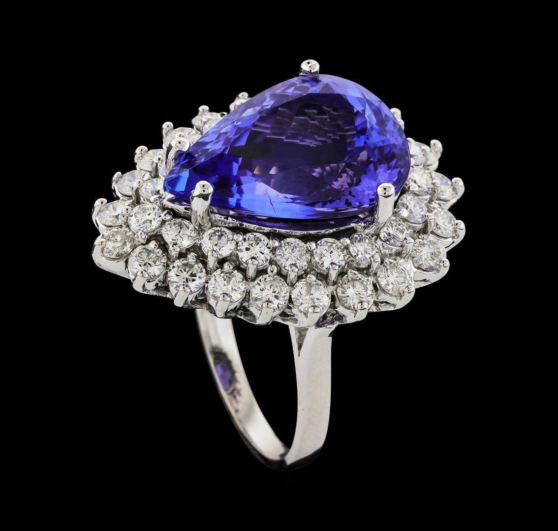 One electronically tested 14KT white gold lady's cast fashion ring with a double basket halo with a bright polish finish. The featured lady's ring has a shank measuring 2.23 millimeters wide. Identified with markings of 'K14'. Condition is new, good workmanship. Containing: One prong set pear modified brilliant cut natural tanzanite, measuring 18.17 x 12.98 x 8.44mm, (depth est.) approximate weight of 12.13ct., clarity is eye clean, medium, moderately strong, violet color, (GIA V 5/4), cut is very good. Transmitting light with no distortion, transparent. Colored gemstones are presumed to have been subjected to commonly used enhancement processes. Graded loose prior to setting in the GIA Laboratory, Report #2175847887. Twenty-One prong set round brilliant cut diamonds, measuring 2.80 - 2.75 x 1.72mm (depth est.) approximate total weight of 21 Stones = 1.68ct. Graded in the setting. Clarity SI-1 to I-1. Color: G - I Cut Good Twenty prong set round brilliant cut diamonds, measuring 2.40 - 2.30 x 1.41mm (depth est.) approximate total weight of 20 Stones = 0.95ct. Graded in the setting. Clarity SI-1 to SI-2. Color: H - I Cut Good. Total Weight of Colored Stones 12.13ct.. Total Weight of Diamonds 2.63ct.. Total Weight of Ring 12.50gm. GAS Appraised at $22,675.00.