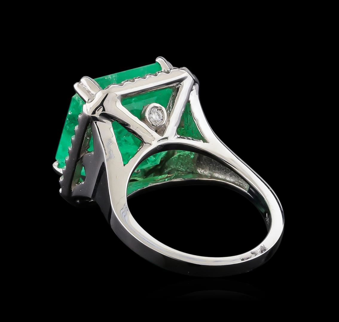 One electronically tested 14KT white gold lady's cast fashion ring with a cathedral halo with a bright polish finish. The featured lady's ring has a shank measuring 2.11 millimeters wide. Identified with markings of "14K". Condition is new, good workmanship. Containing: One prong set emerald step cut natural emerald, measuring 13.95 x 13.24 x 10.20mm, exact weight 12.69ct., clarity is moderately included, type III, medium, very slightly grayish, green color, (GIA G 5/3), cut is good. Transmitting light somewhat diffusely, transparent to translucent. Naturally occurring internal & external characteristics are present. Clarity enhanced. Graded loose prior to setting in the GIA Laboratory, Report #2175501592.Two prong set round brilliant cut diamonds, measuring 2.00 - 1.90 x 1.21mm (depth est.) approximate total weight of 2 Stones = 0.06ct. Graded in the setting. Clarity: SI-2. Color: H. Cut Good Thirty-Four prong set round brilliant cut diamonds, measuring 1.40 - 1.30 x 0.84mm (depth est.) approximate total weight of 34 Stones = 0.32ct. Graded in the setting. Clarity: SI-1 to I-1. Color: G - Good. Total Weight of Colored Stones 12.69ct. Total Weight of Diamonds 0.38ct. Total Weight of Ring 10.90gm. GAS Appraised at $15,560.00.