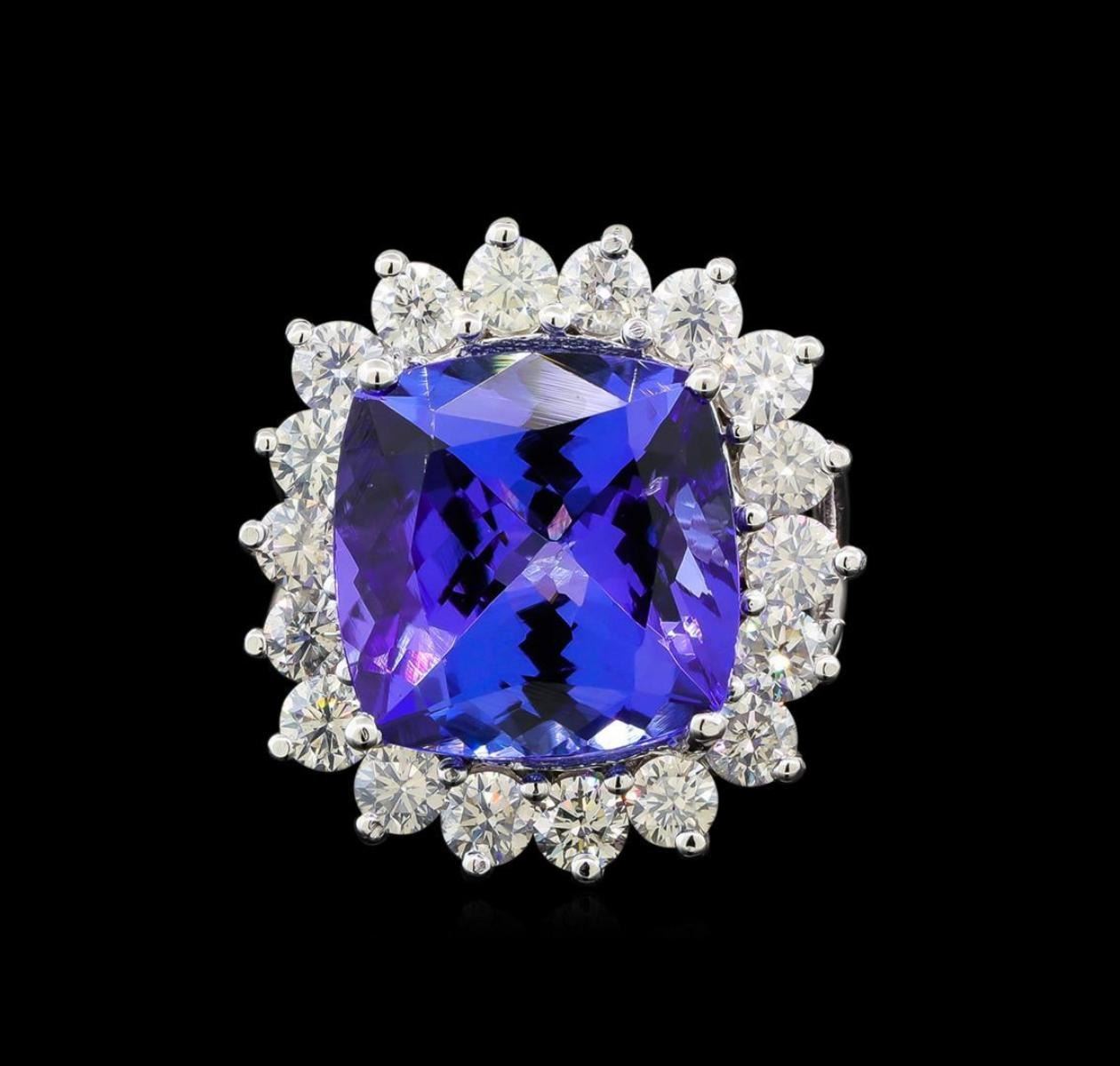 One electronically tested 14KT white gold lady's cast fashion ring with a split shank basket halo with a bright polish finish. The featured lady's ring has a shank measuring 2.50 millimeters wide. Identified with markings of '14K'. Condition is new, good workmanship. Containing: One prong set square cushion modified brilliant cut natural tanzanite, measuring 14.28 x 14.10 x 8.73mm, (depth est.) approximate weight of 13.03ct., clarity is eye clean, medium dark, moderately strong, bluish violet color, (GIA bV 6/4), cut is very good. Transmitting light with no distortion, transparent. Colored gemstones are presumed to have been subjected to commonly used enhancement processes. Graded loose prior to setting in the GIA Laboratory, Report #6177668372. Eighteen prong set round brilliant cut diamonds, measuring 3.50 - 3.40 x 2.07mm (depth est.) approximate total weight of 18 Stones = 2.73ct. Graded in the setting. Clarity SI-1 to I-1. Color: H - J Cut Very Good. Total Weight of Colored Stones 13.03ct.. Total Weight of Diamonds 2.73ct.. Total Weight of Ring 10.80gm. GAS Appraised.
