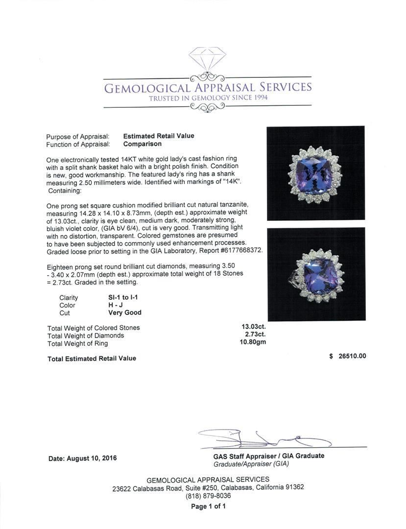 One electronically tested 14KT white gold lady's cast fashion ring with a split shank basket halo with a bright polish finish. The featured lady's ring has a shank measuring 2.50 millimeters wide. Identified with markings of '14K'. Condition is new, good workmanship. Containing: One prong set square cushion modified brilliant cut natural tanzanite, measuring 14.28 x 14.10 x 8.73mm, (depth est.) approximate weight of 13.03ct., clarity is eye clean, medium dark, moderately strong, bluish violet color, (GIA bV 6/4), cut is very good. Transmitting light with no distortion, transparent. Colored gemstones are presumed to have been subjected to commonly used enhancement processes. Graded loose prior to setting in the GIA Laboratory, Report #6177668372. Eighteen prong set round brilliant cut diamonds, measuring 3.50 - 3.40 x 2.07mm (depth est.) approximate total weight of 18 Stones = 2.73ct. Graded in the setting. Clarity SI-1 to I-1. Color: H - J Cut Very Good. Total Weight of Colored Stones 13.03ct.. Total Weight of Diamonds 2.73ct.. Total Weight of Ring 10.80gm. GAS Appraised.
