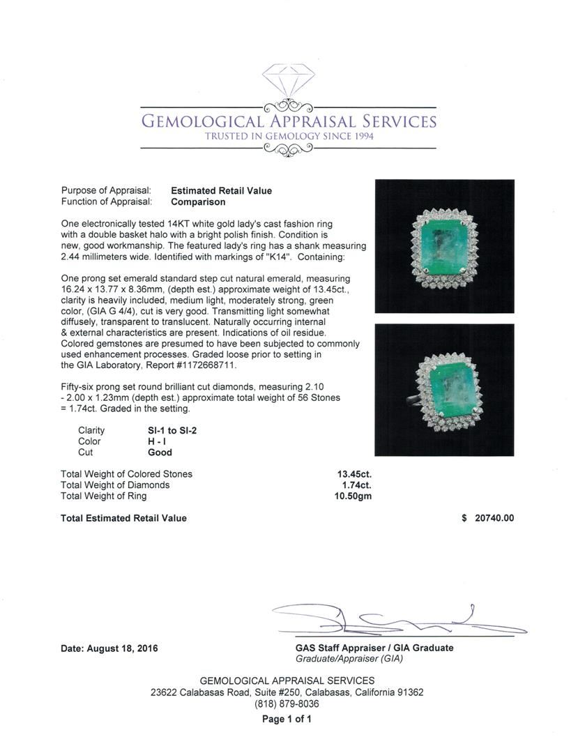 One electronically tested 14KT white gold lady's cast fashion ring with a double basket halo with a bright polish finish. The featured lady's ring has a shank measuring 2.44 millimeters wide. Identified with markings of 'K14'. Condition is new, good workmanship. Containing: One prong set emerald standard step cut natural emerald, measuring 16.24 x 13.77 x 8.36mm, (depth est.) approximate weight of 13.45ct., clarity is heavily included, medium light, moderately strong, green color, (GIA G 4/4), cut is very good. Transmitting light somewhat diffusely, transparent to translucent. Naturally occurring internal & external characteristics are present. Indications of oil residue. Colored gemstones are presumed to have been subjected to commonly used enhancement processes. Graded loose prior to setting in the GIA Laboratory, Report #1172668711. Fifty-Six prong set round brilliant cut diamonds, measuring 2.10 - 2.00 x 1.23mm (depth est.) approximate total weight of 56 Stones = 1.74ct. Graded in the setting. Clarity SI-1 to SI-2. Color: H - I Cut Good. Total Weight of Colored Stones 13.45ct.. Total Weight of Diamonds 1.74ct.. Total Weight of Ring 10.50gm. GAS Appraised at $20,740.00.